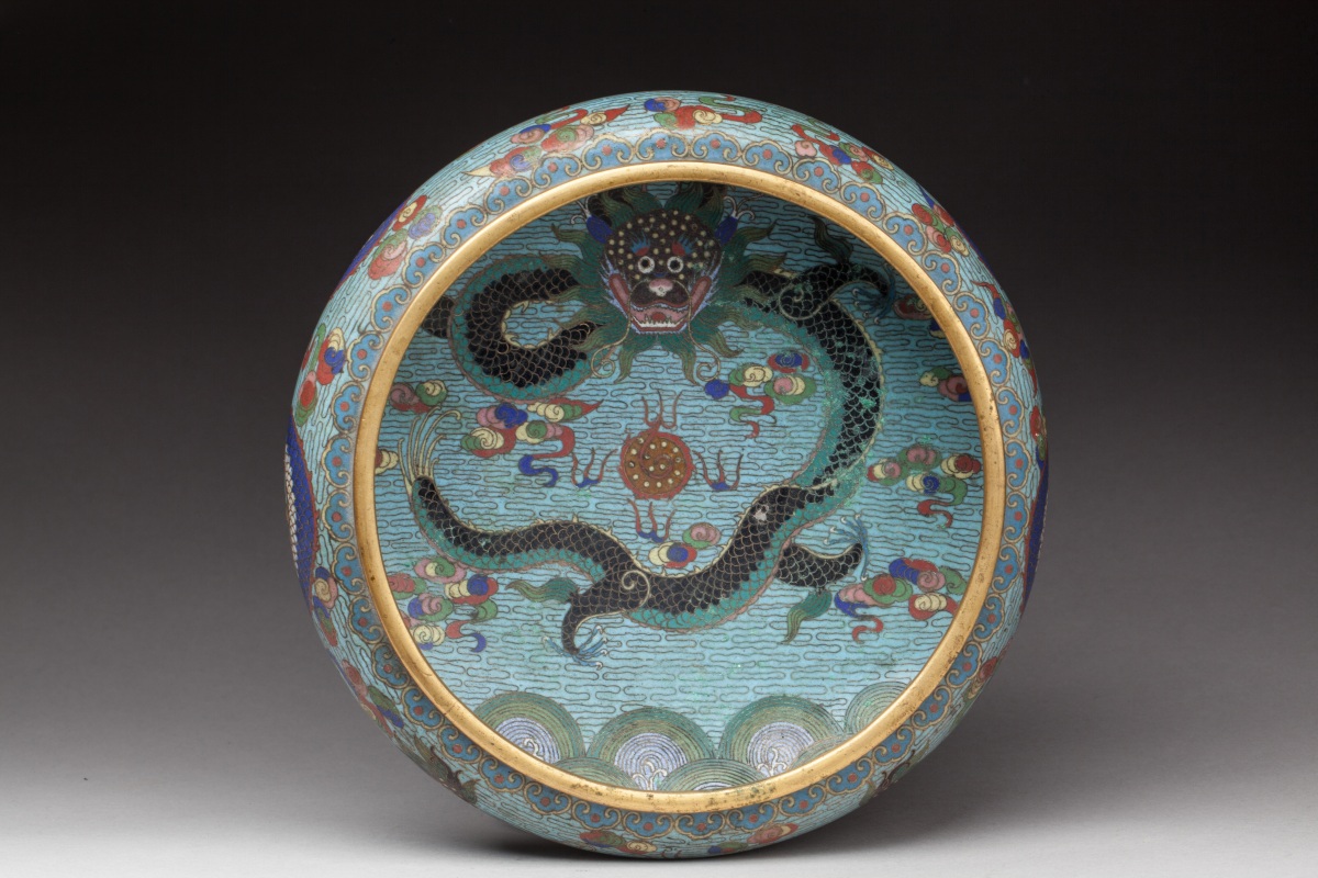 COUPE en bronze et émaux cloisonnés à décor de dragons pourchassant la perle sacrée parmi les nuages sur fond bleu turquoise.