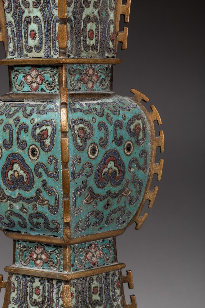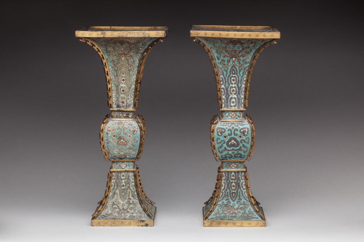 CHINA. A pair of cloisonné enameled bronze HU VASES. 19th-20th century.