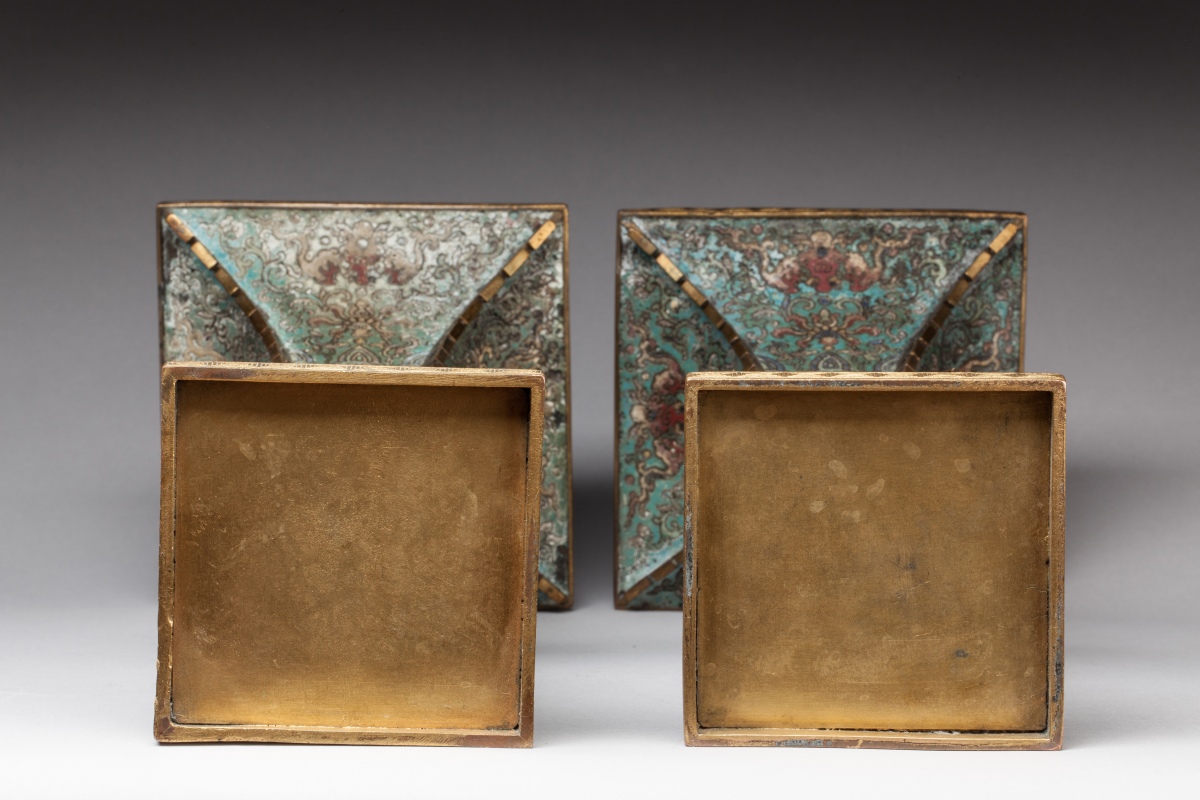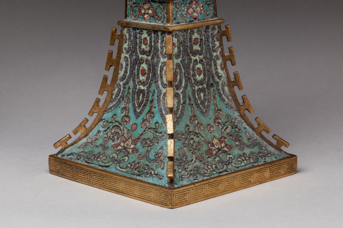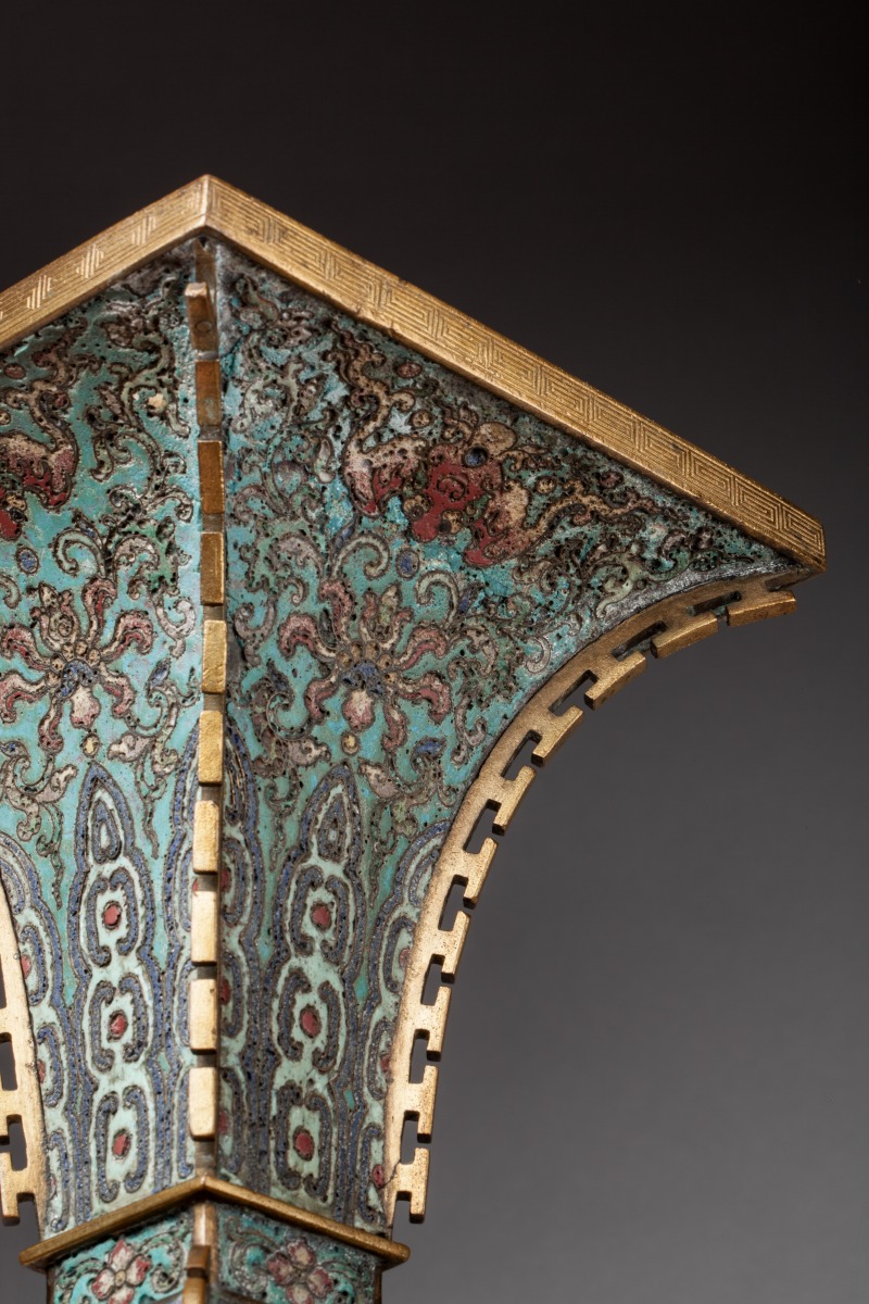 Paire de VASES CORNET (HU) de style archaïque à pans coupés, en bronze cloisonné d'émaux décoré de motifs stylisés sur fond turquoise.