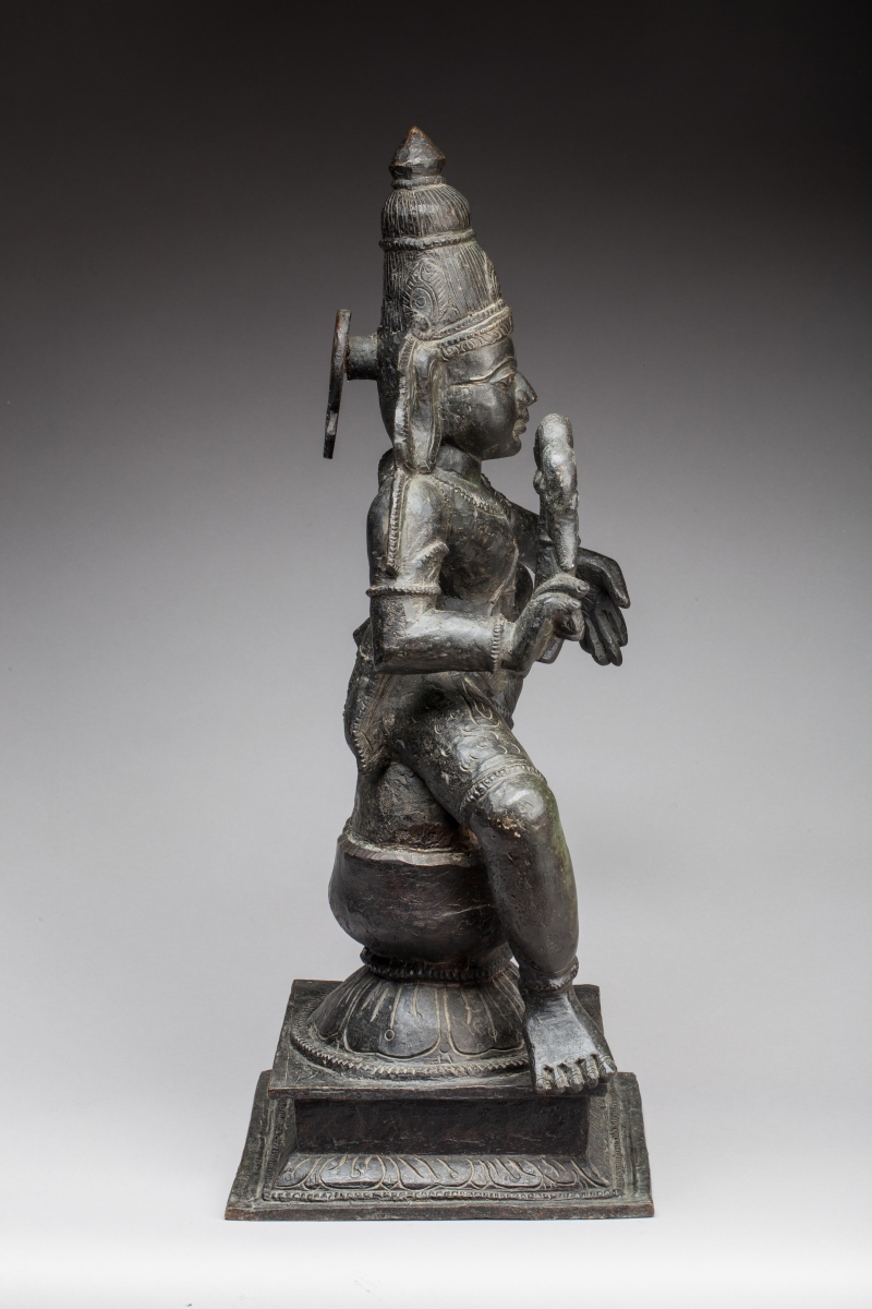 Le dieu protecteur des villages d'inde du Sud est représenté assis en attitude de délassement (sukhasana) sur un socle lotiforme, la jambe gauche retenue par un yogapatta et brandissant un fouet de la main droite.