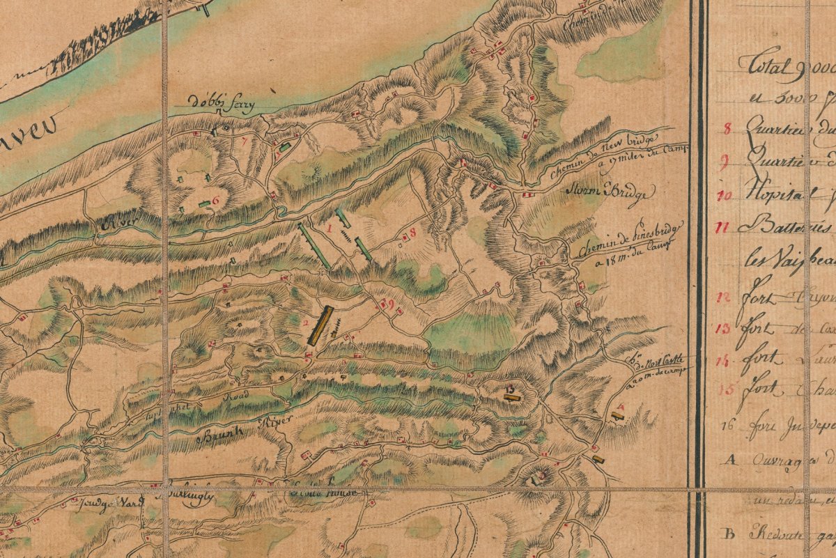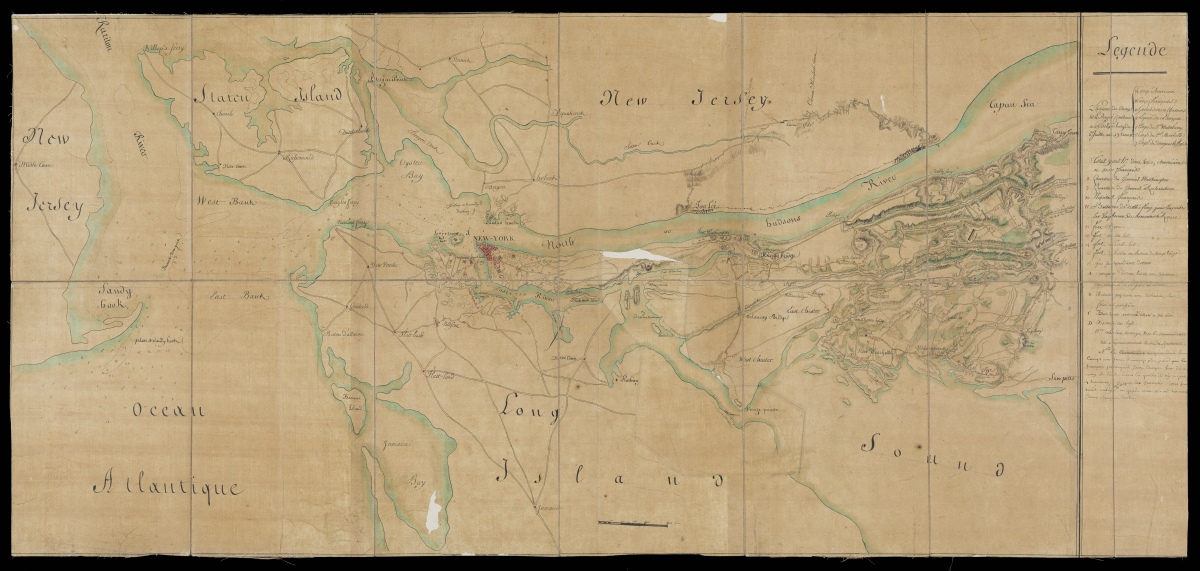 Figurant la position de l'armée franco-américaine, établie autour de Philipsburg et de Weschester, assiégeant la ville de New York et des fortifications avoisinantes occupées par l'armée britannique, du 6 juillet au 19 août 1781. Les lieux représentés vont des zones de Tarrytown à Staten Island, à la ville de New York, ainsi que les colonies denses de la pointe sud de l'île de Manhattan et sur la rive opposée de l'East River à Brooklyn. Y sont reproduits les détails militaires : camps américains et français, la position des grenadiers et des chasseurs, la légion de Lauzun, les divers corps de troupes volontaires américaines, les quartiers généraux du général Washington et celui du général Rochambeau, l'hôpital français, les forts, ouvrages, redoutes, blockhouses et batteries, avec une légende manuscrite qui indique qu'au total l'armée combinée est composée de 9.000 hommes dont 4.000 américains et 5.000 français ; et des éléments géographiques et topographiques : villes, maisons, routes, rivières, ponts et relief.