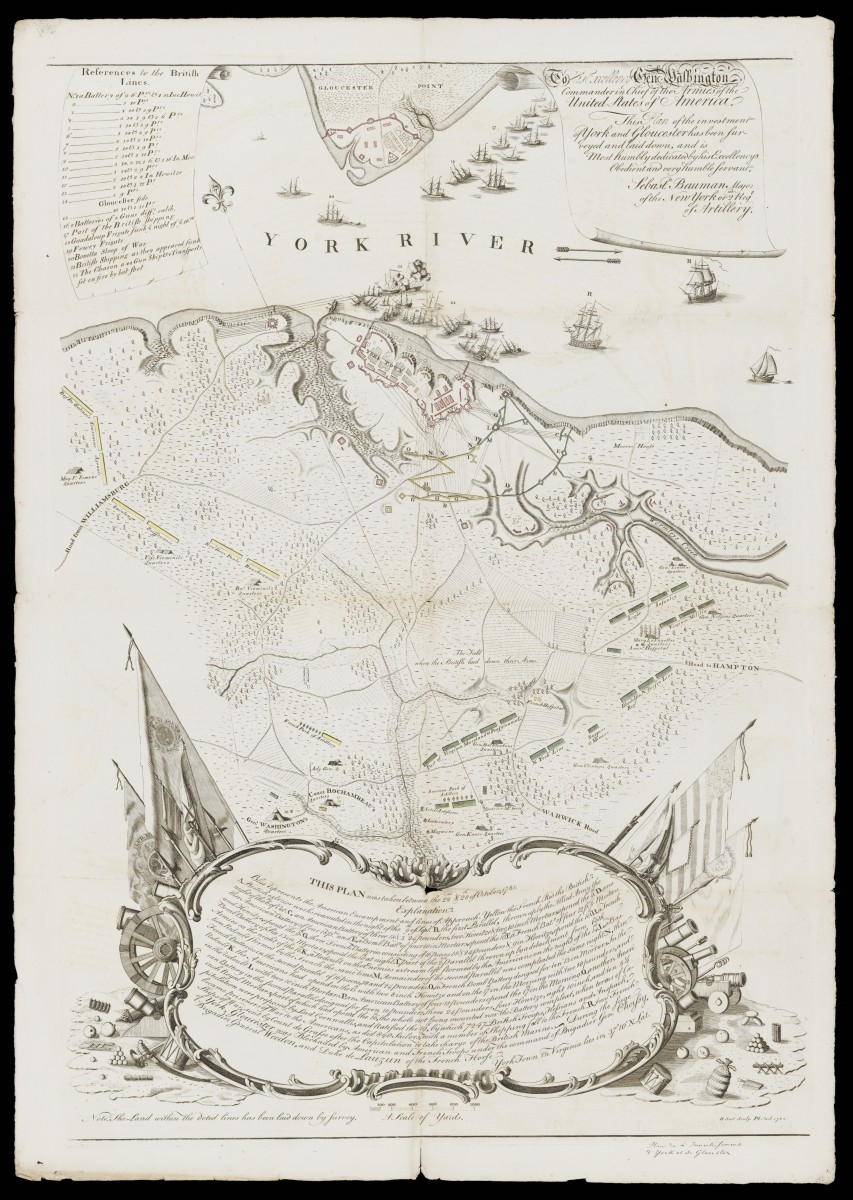 "To His Excellency General Washington Commander in Chief of the Armies of the United States of America. This plan of the investment of York and Gloucester has been surveyed and laid down, and is most humbly dedicated by his Excellency's obedient and very humble servant, Sebastian Bauman, Major of the New York of 2nd Regent of Artillery." Imprimé par R[obert] Scot, Philadelphie, 1782.