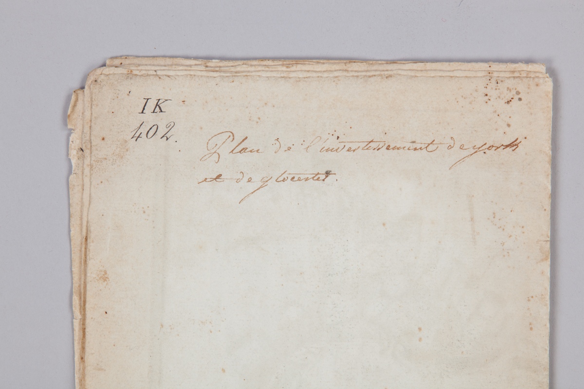Au dos, inscriptions manuscrites à la plume "IK 402" [cote de classement de la bibliothèque de la famille de Vimeur de Rochambeau] et titre "Plan de l'investissement de York et de Gloucester"