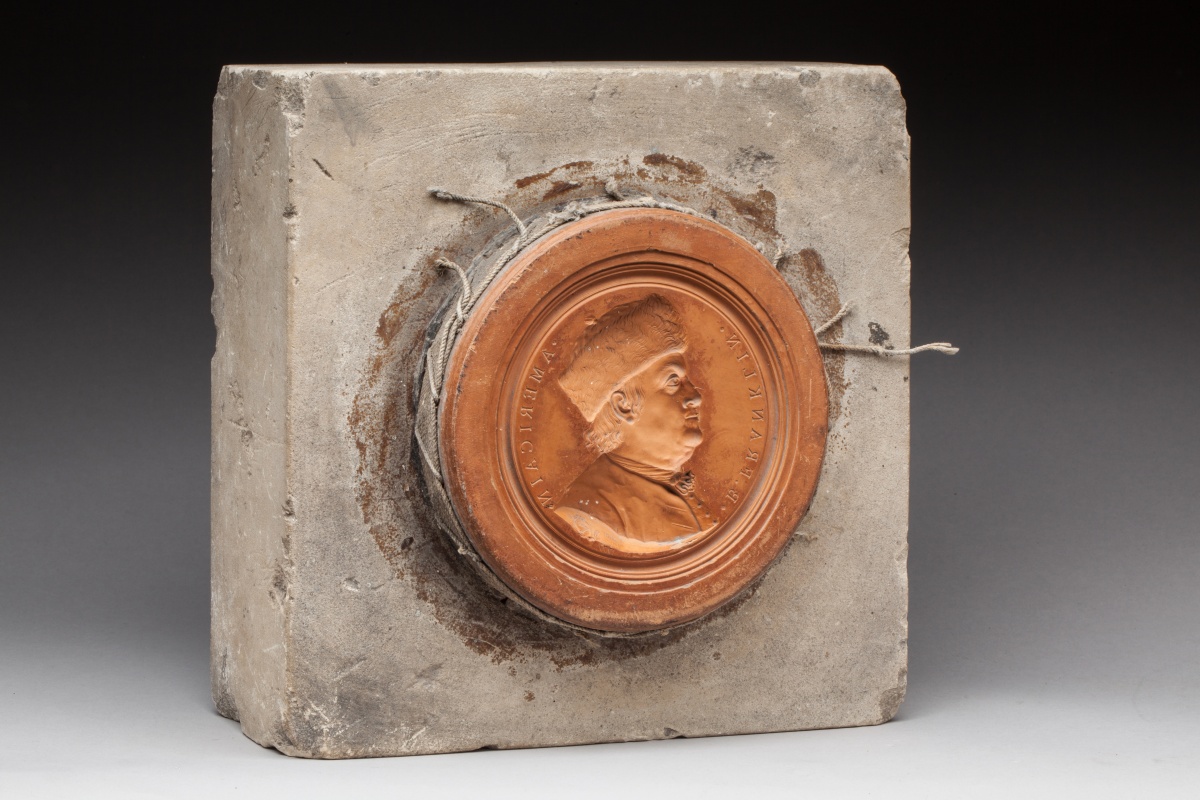 After Jean-Baptiste NINI. Terracotta MOULD figuring AMERICAN BENJAMIN FRANKLIN set on limestone, 1777.