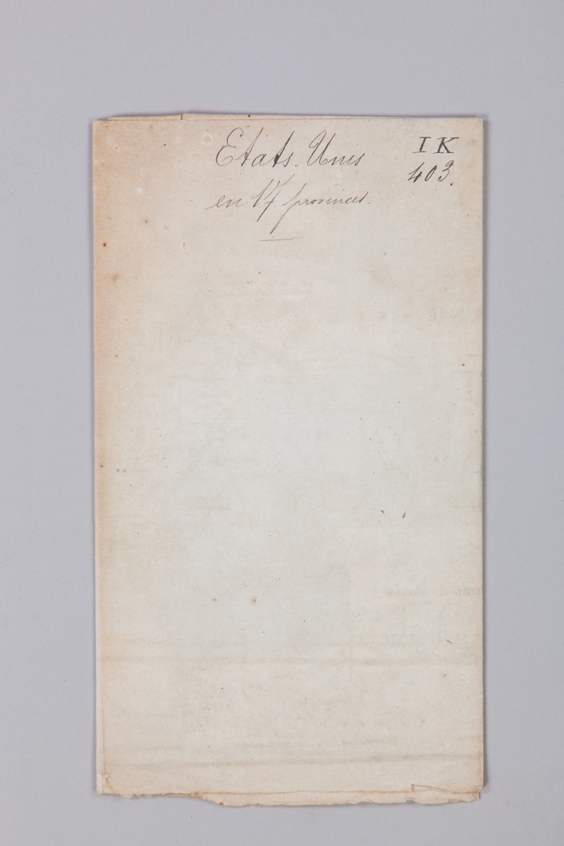 Inscription à la plume au dos "IK 403" [cote de classement de la bibliothèque de la famille de Vimeur de Rochambeau] et titre "États-Unis en 17 provinces".