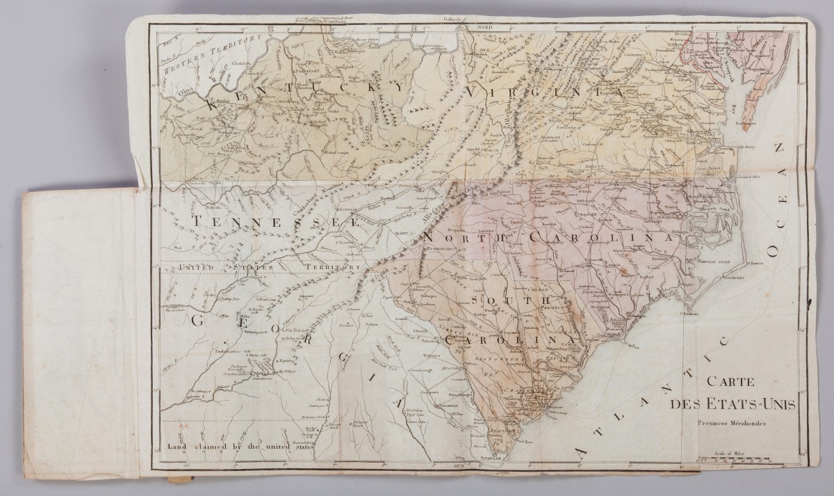Joint : 2 cartes gravées et rehaussées à l'aquarelle (pliures, tâches), tirées de la même relation de voyage du duc de La Rochefoucauld-Liancourt intitulées "Voyage dans les États-Unis d'Amérique, fait en 1795, 1796 et 1797" : "Carte des États-Unis, provinces septentrionales" (haut. 55, larg. 34 cm) et "Carte des États-Unis, provinces méridionales" (haut. 53, larg. 35 cm).