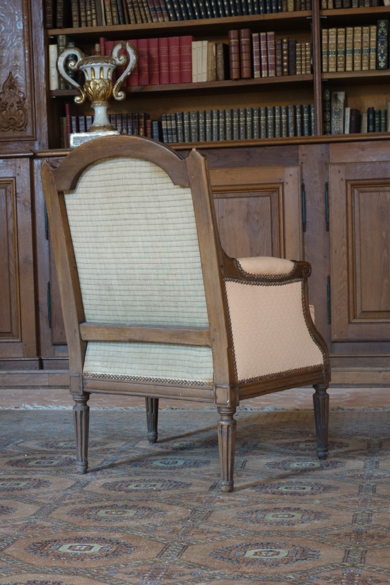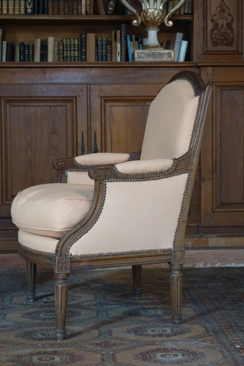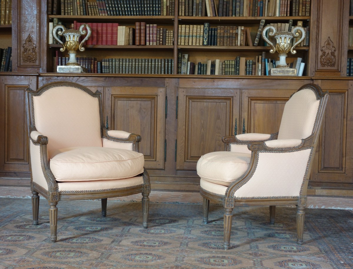 Paire de BERGÈRES en bois naturel mouluré. Le dossier est en chapeau de gendarme, les accotoirs à manchettes supportés par des consoles d'accotoir à décor feuillagé. Les dés de raccordement ornés de rosaces surmontent quatre pieds à section ronde fuselés, cannelés et rudentés terminés par une double boule aplatie.
