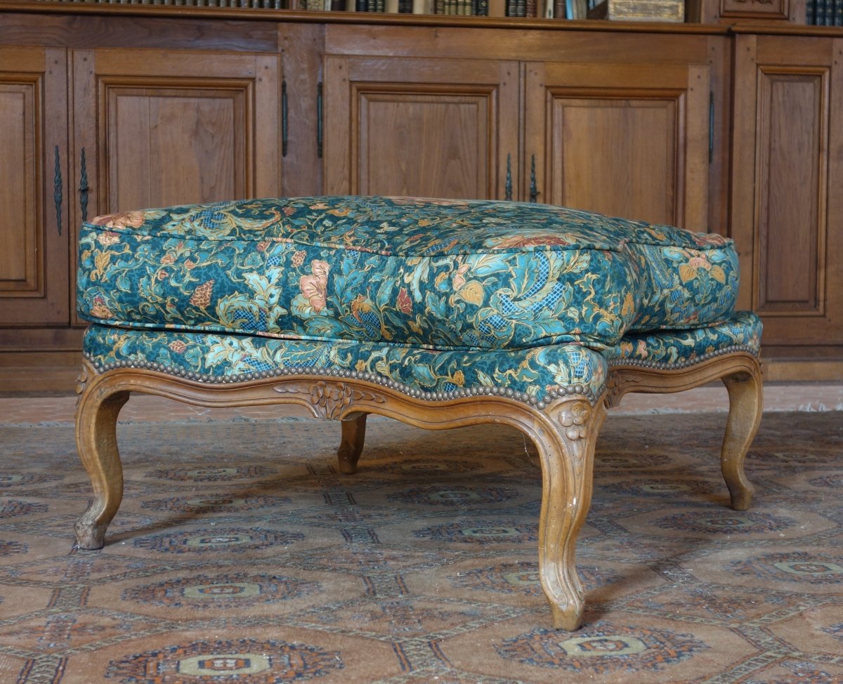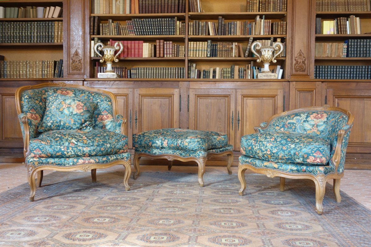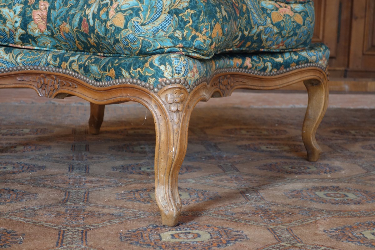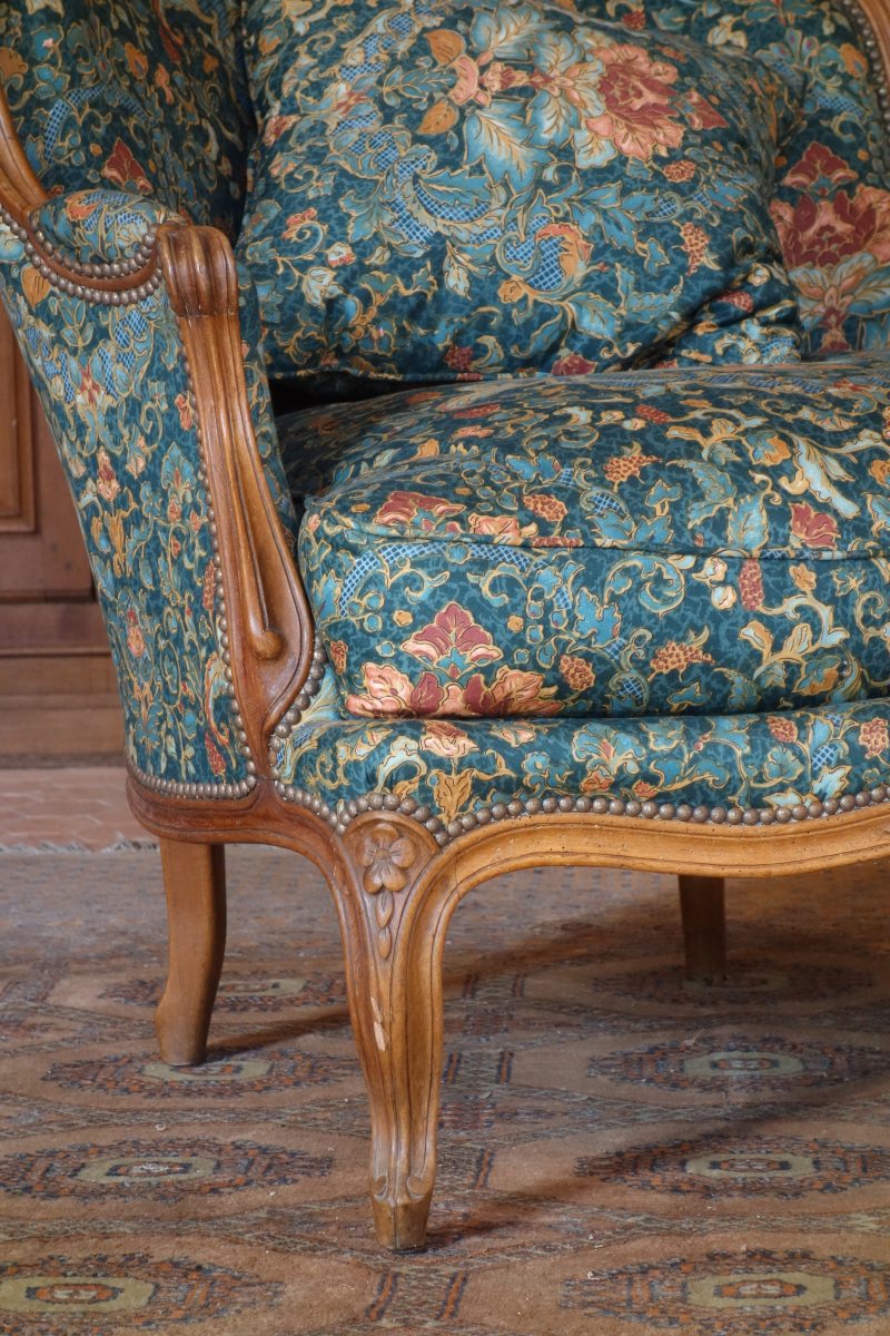 DUCHESSE BRISÉE en noyer mouluré et sculpté composée de trois élements. La traverse supérieure du dossier et la ceinture sont centrées d'un bouquet de fleurs. Supports d'accotoir galbés et piètement antérieur orné de fleurs.