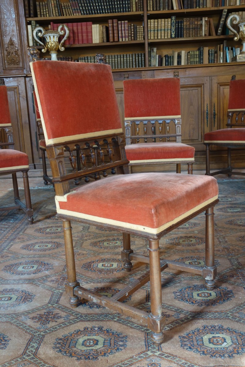 Six CHAISES en noyer mouluré et sculpté. Le dossier en bandeau est surmonté de deux têtes de lions, la traverse inférieure est ajourée en galerie. Elles reposent sur quatre pieds droits à section ronde reliés par une entretoise en H et terminés par un bout de pied en toupie.