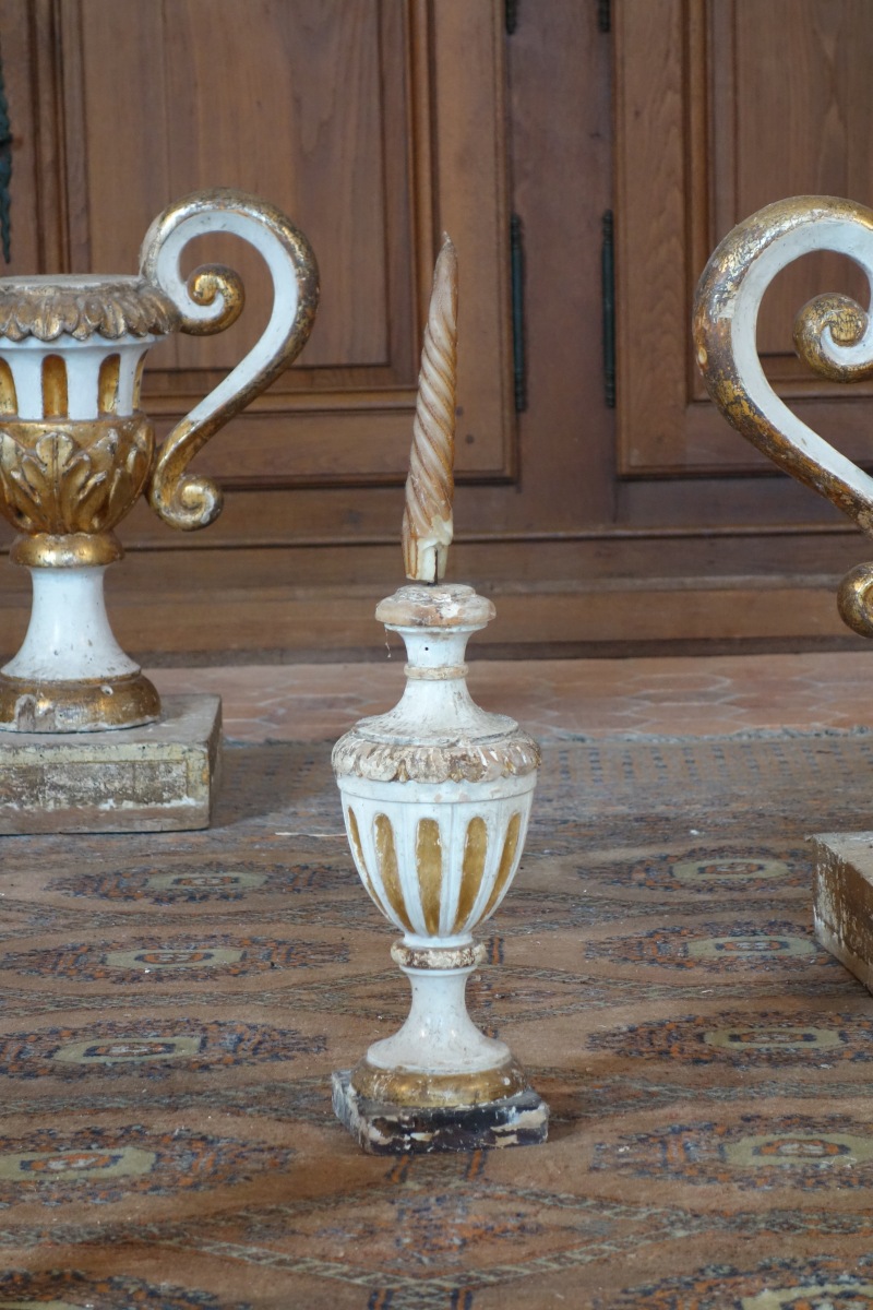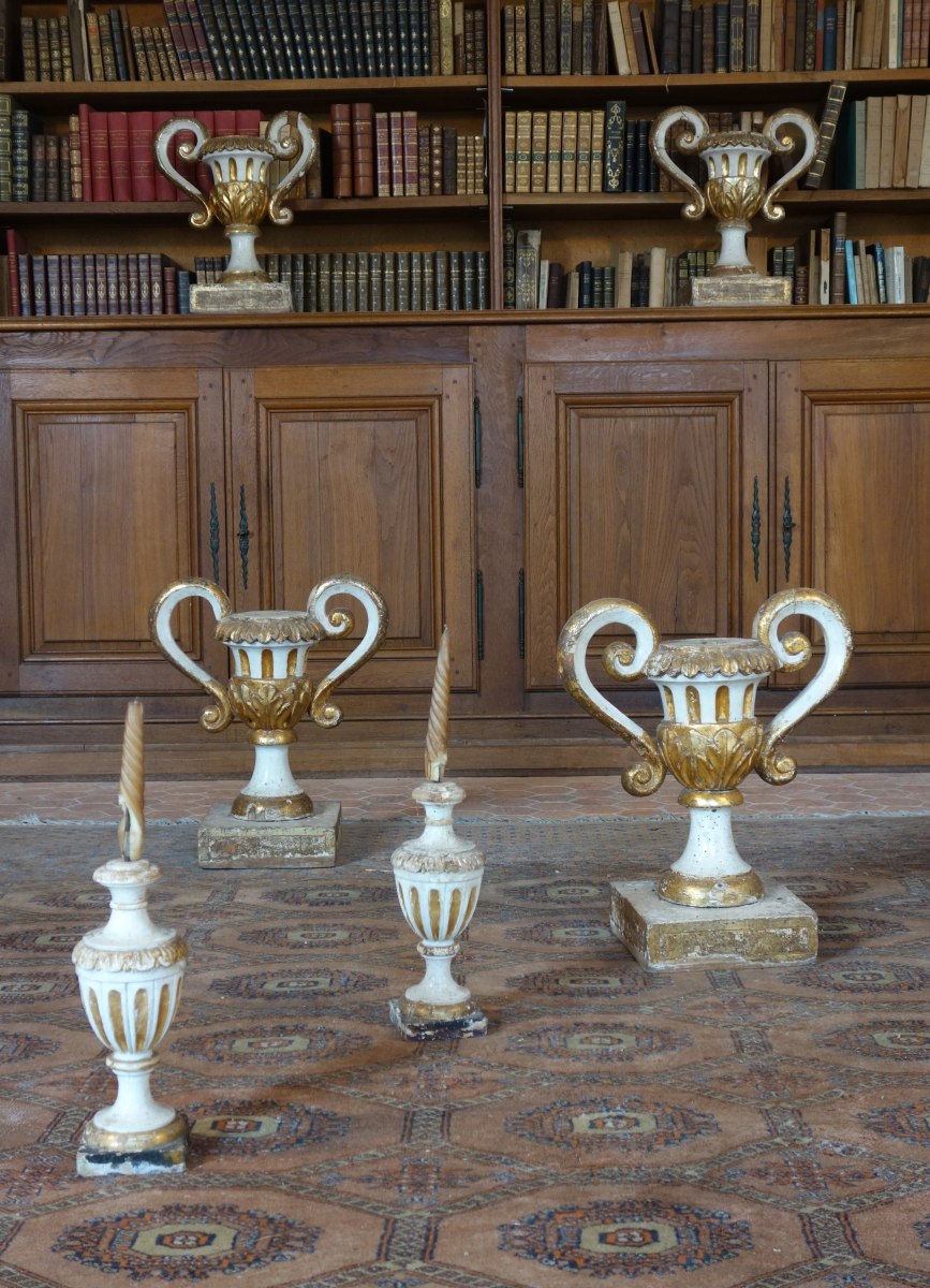 ÉLÉMENTS de DÉCORATION en bois mouluré ou sculpté, peint et doré, comprenant : une paire de VASES balustres, une paire de VASES MÉDICIS, une paire de FLAMBEAUX. en bois sculpté laqué blanc et or.