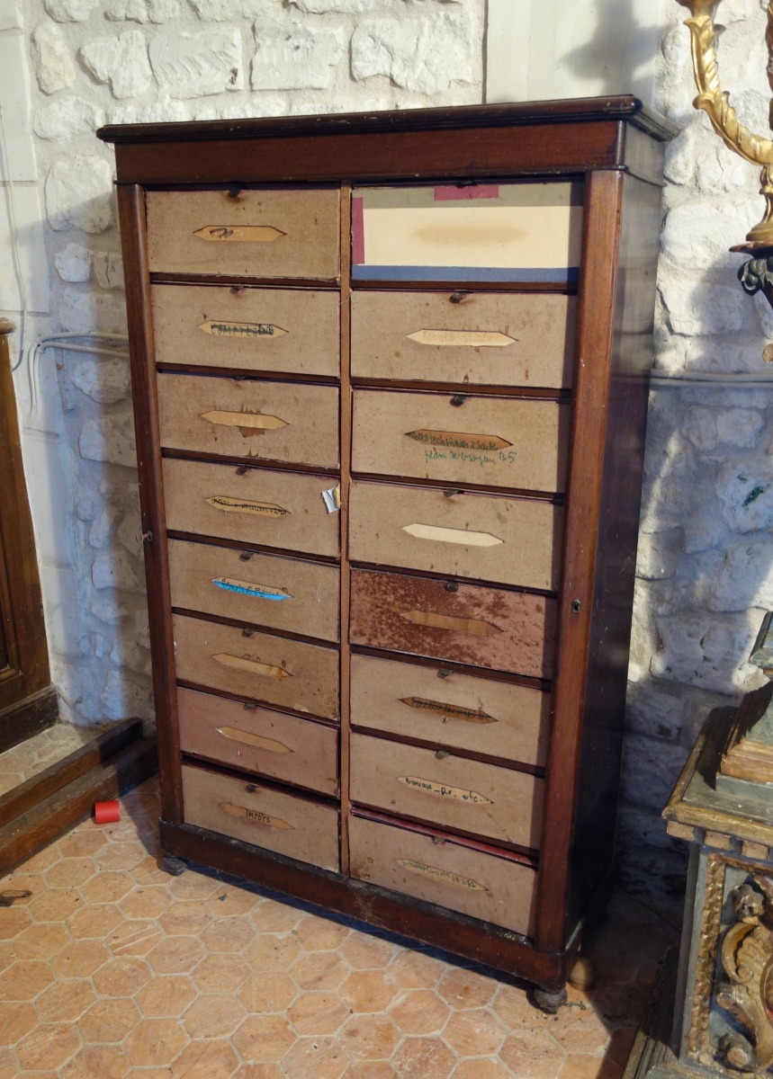 CARTONNIER en bois naturel de forme rectangulaire à 16 classeurs.