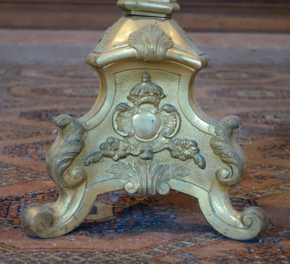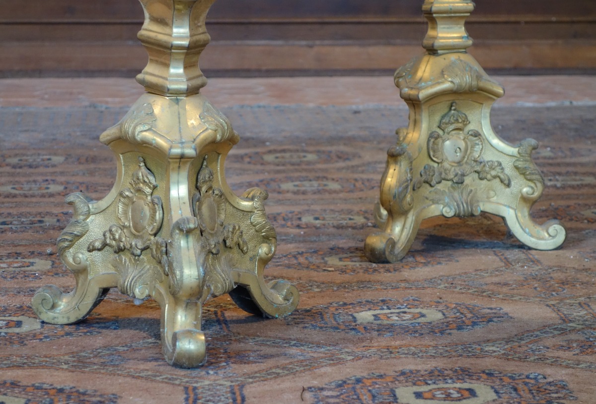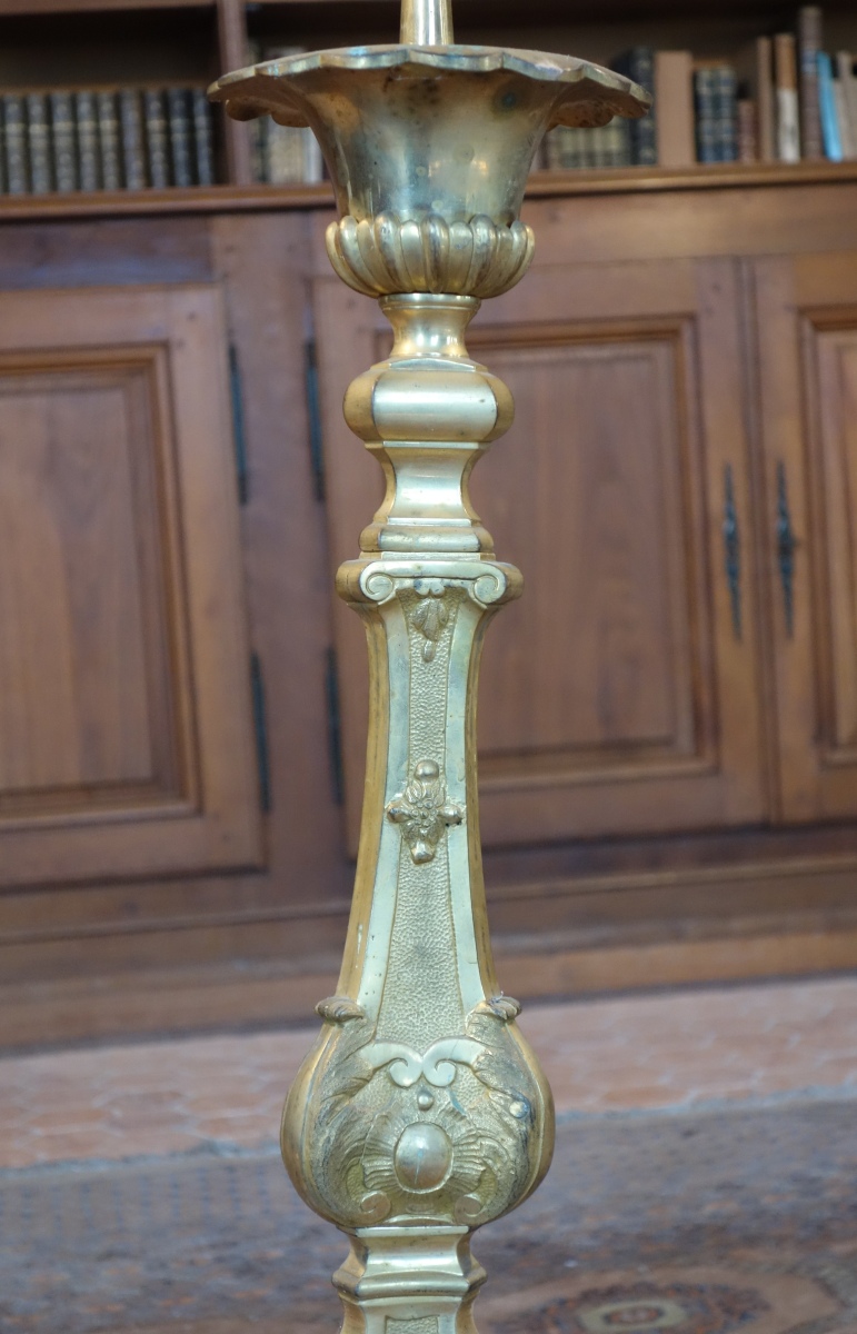 Paire de PIQUE-CIERGES en métal doré (bronze ?) de forme architecturée.