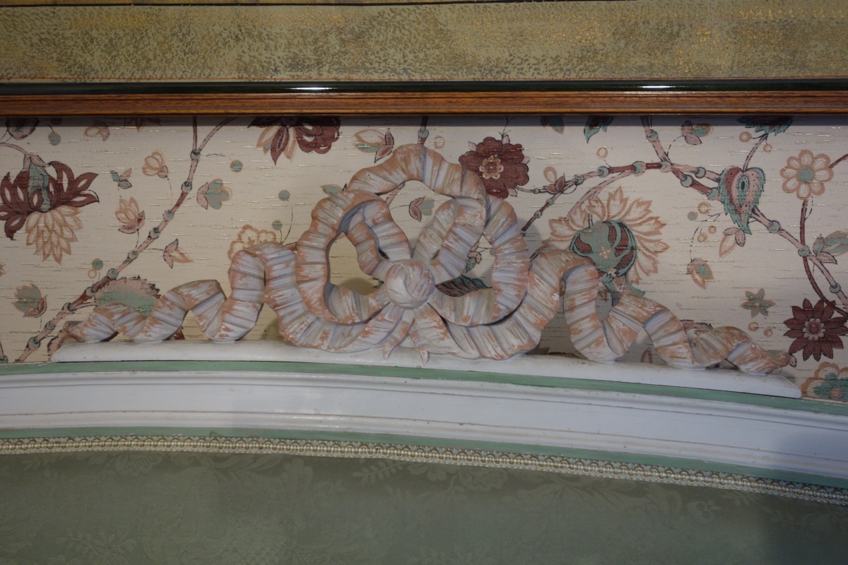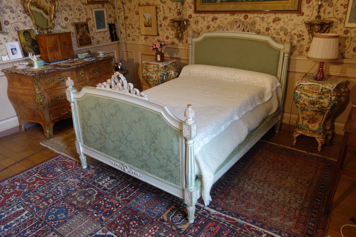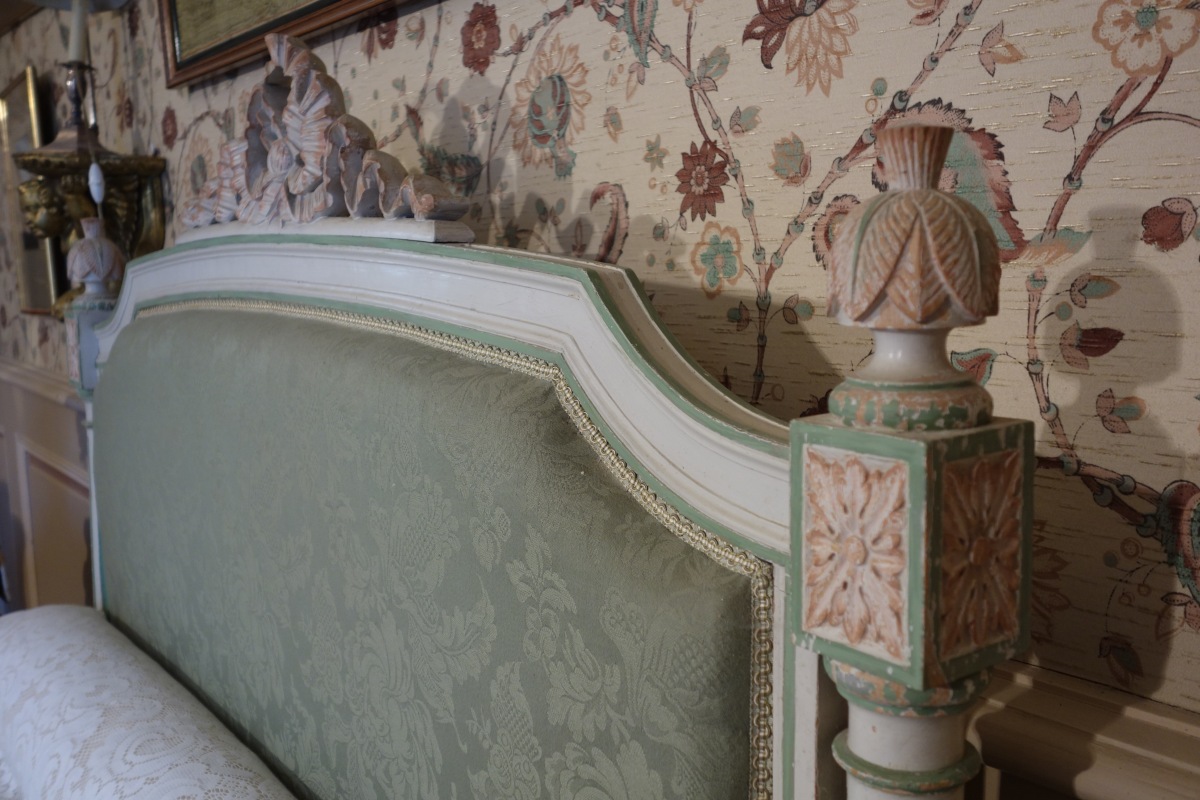 LIT en bois mouluré, sculpté et laqué blanc, rose et vert. Garniture de soie verte.
