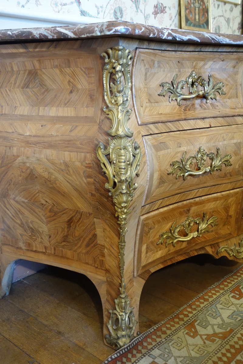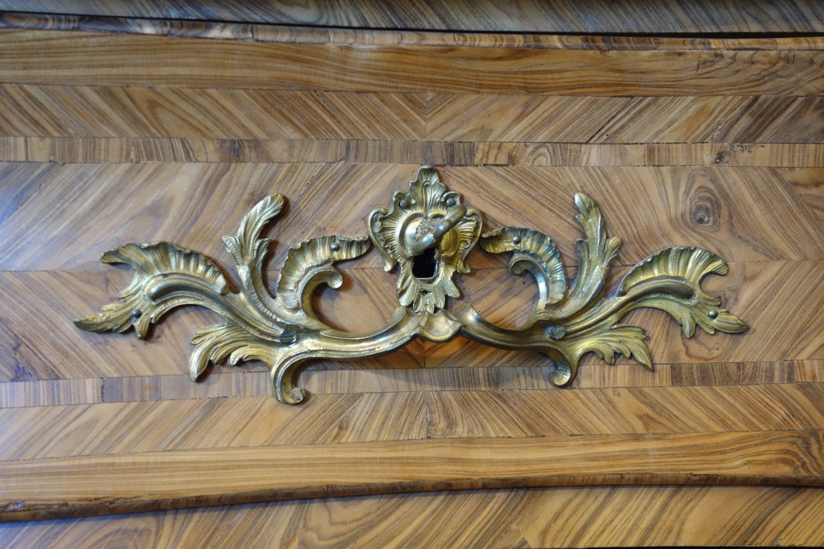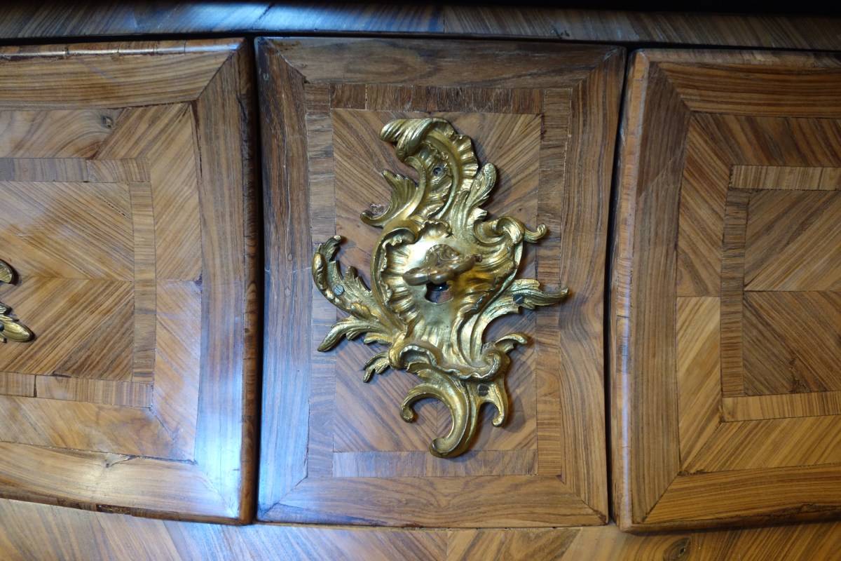 Riche garniture en bronze doré de style rocaille telle que, entrées de serrure, poignées de tirage, chutes d'angles, sabots et tablier.