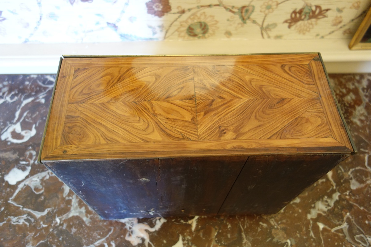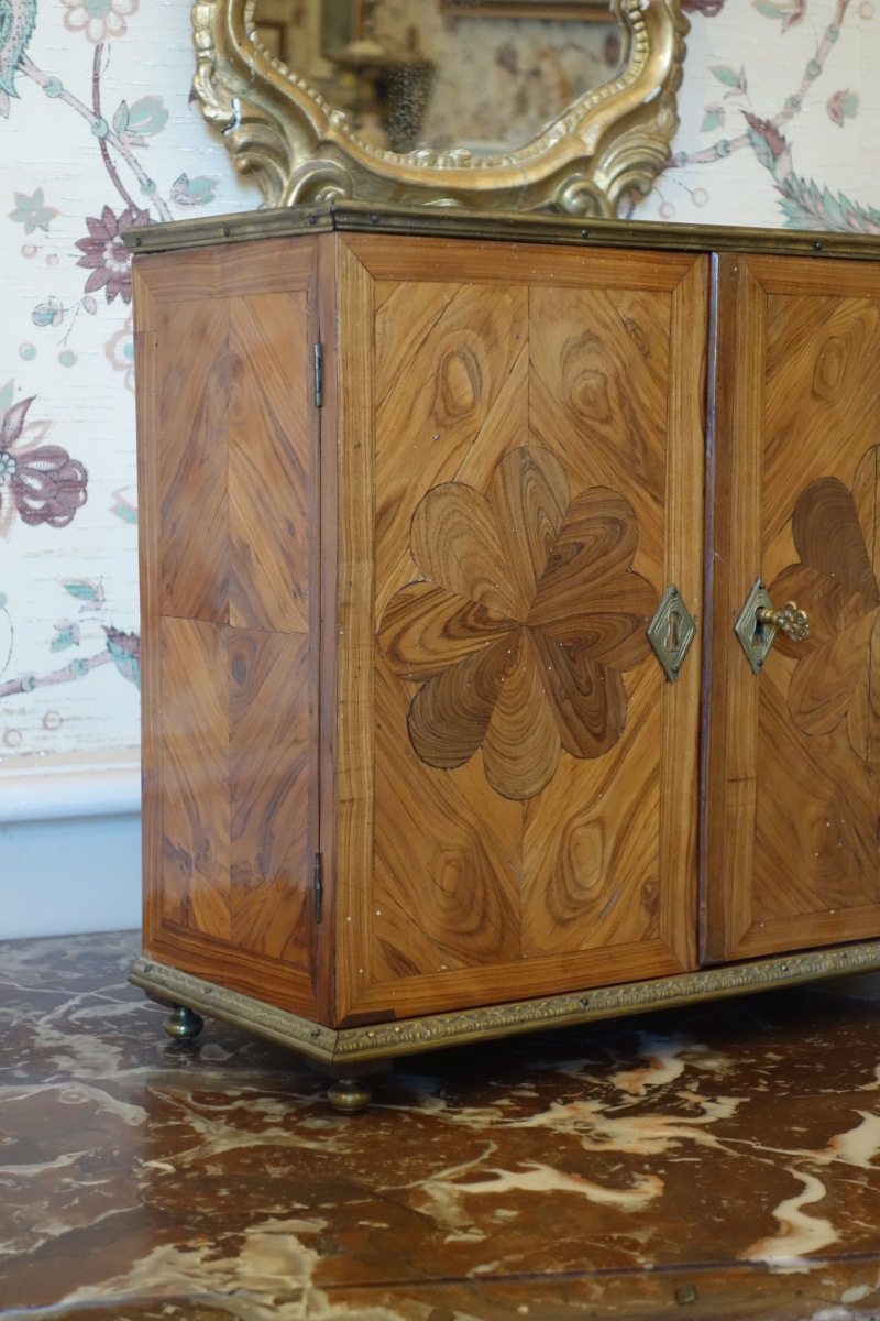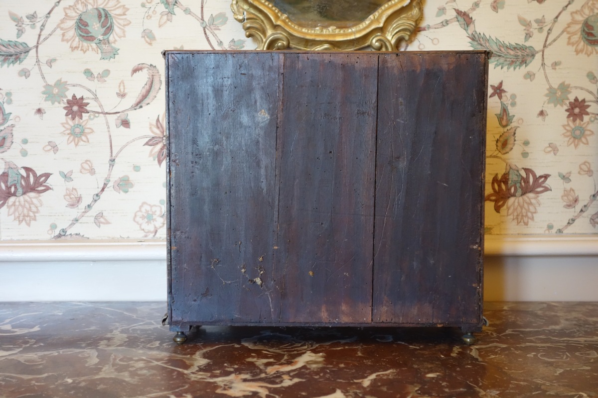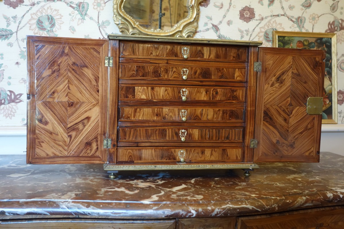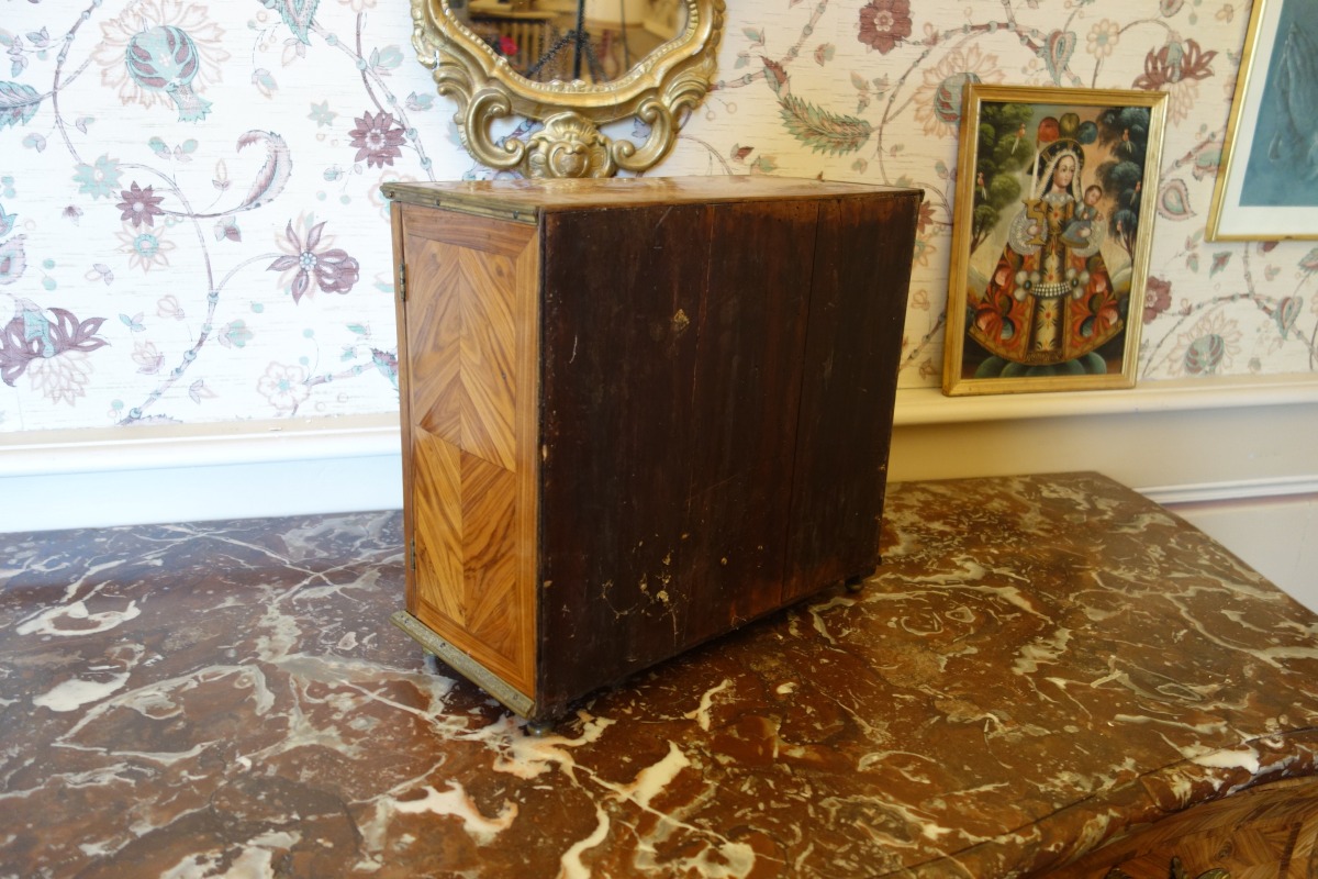 Petit MÉDAILLER en placage de bois de rose ? de forme rectangulaire ouvrant par deux vantaux marquetés de rosaces sur six tiroirs numérotés en chiffres arabes dans des médaillons feuillagés en façade. Il repose sur quatre pieds toupie réunis par une lingotière métallique à feuilles