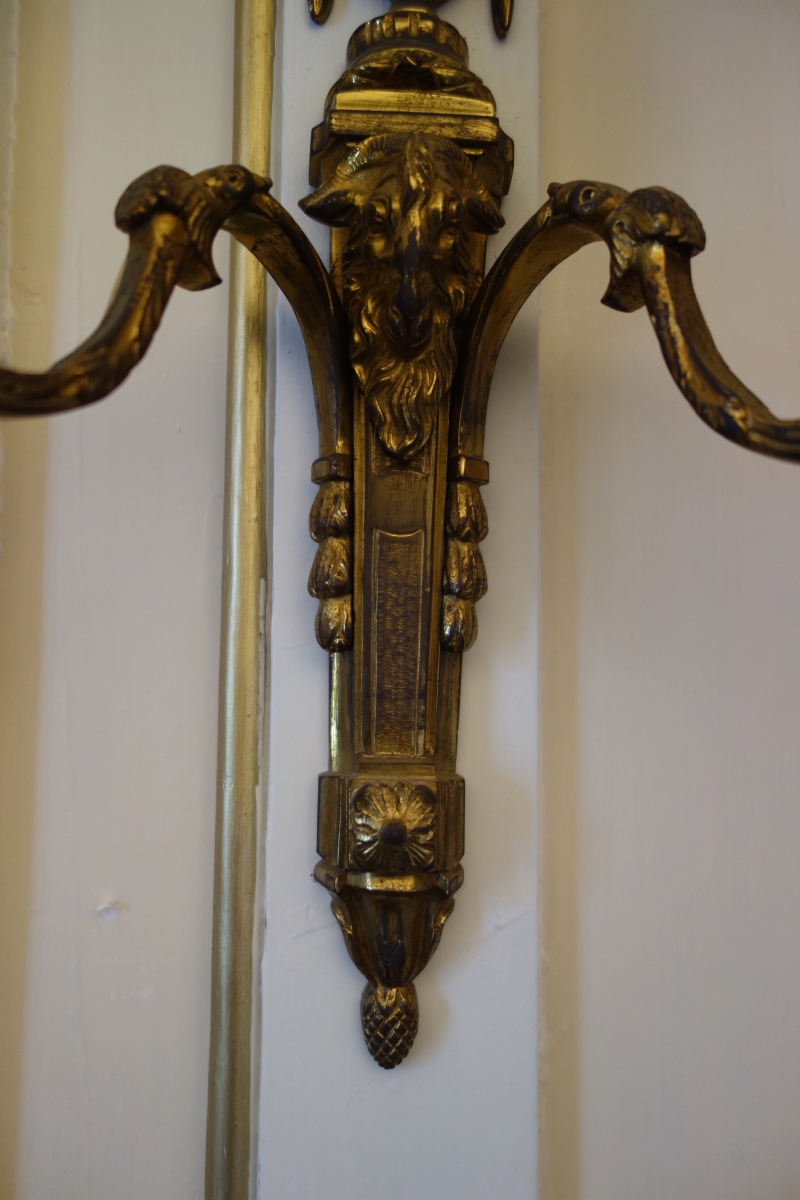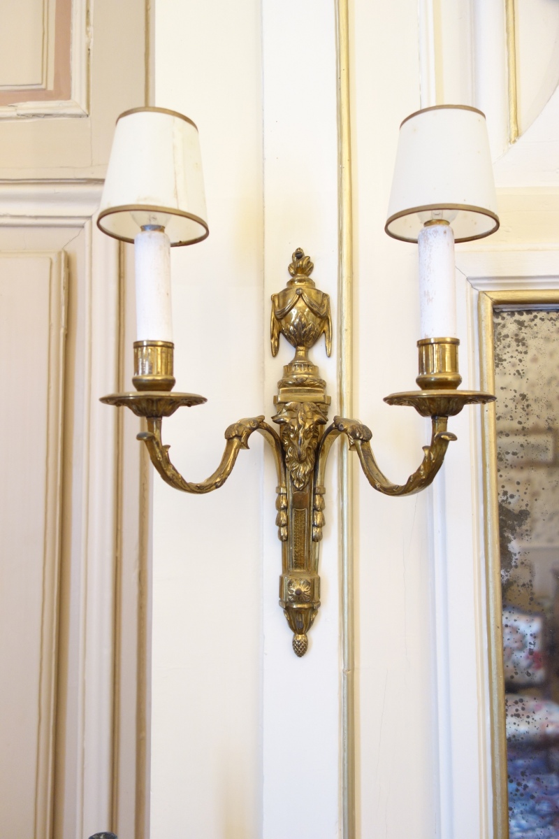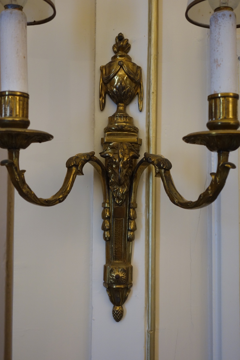 Paire d'APPLIQUES à deux bras de lumière en bronze ciselé et doré de style néoclassique. Ornées dune urne à l'amortissement, fût en gaine orné d'une tête de bouc, se terminant par une pomme de pin.