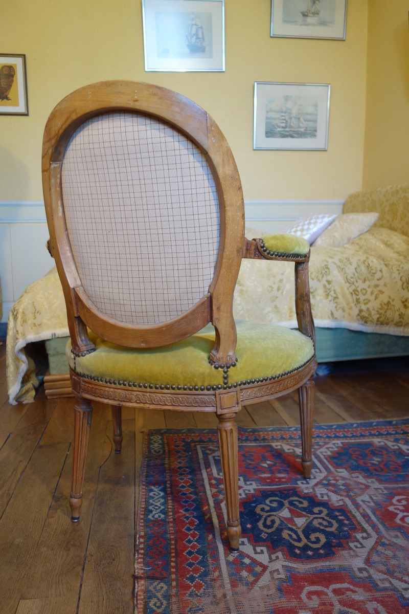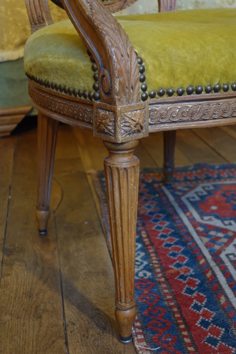 FAUTEUIL CABRIOLET en bois mouluré et sculpté. Accotoirs à manchettes tombant en retrait de la ceinture, ornés de feuilles d'acanthes et rangs de perles. Ceinture sculptée d'une frise d'entrelacs. Pieds à section ronde fuselés cannelés.