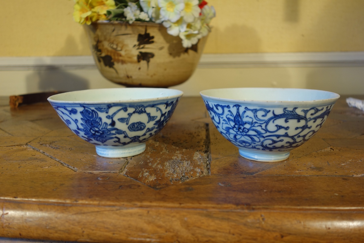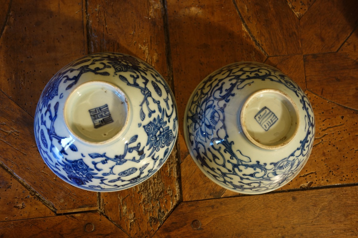 - CHINE. 2 bols en porcelaine bleu et blanc à décor de lambrequins.