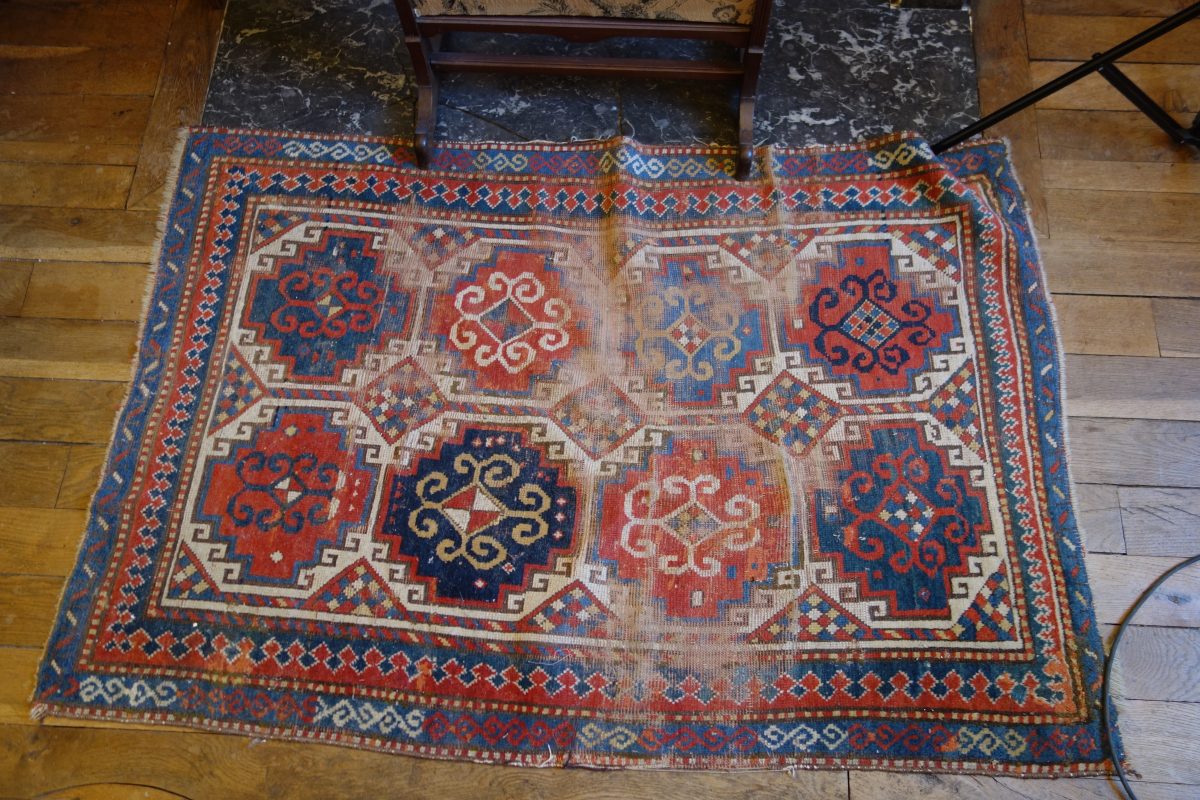 - TAPIS en laine à fond bleu. Décor de médaillons hexagonaux rouges et bleus. Bordure rouge encadrée d'une contre-bordure bleue.