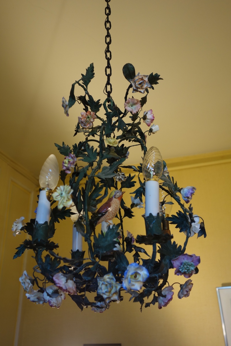 LUSTRE CAGE à quatre bras de lumière en tôle découpée et laquée vert en forme d'une multitude de fleurs et d'un oiseau en porcelaine.