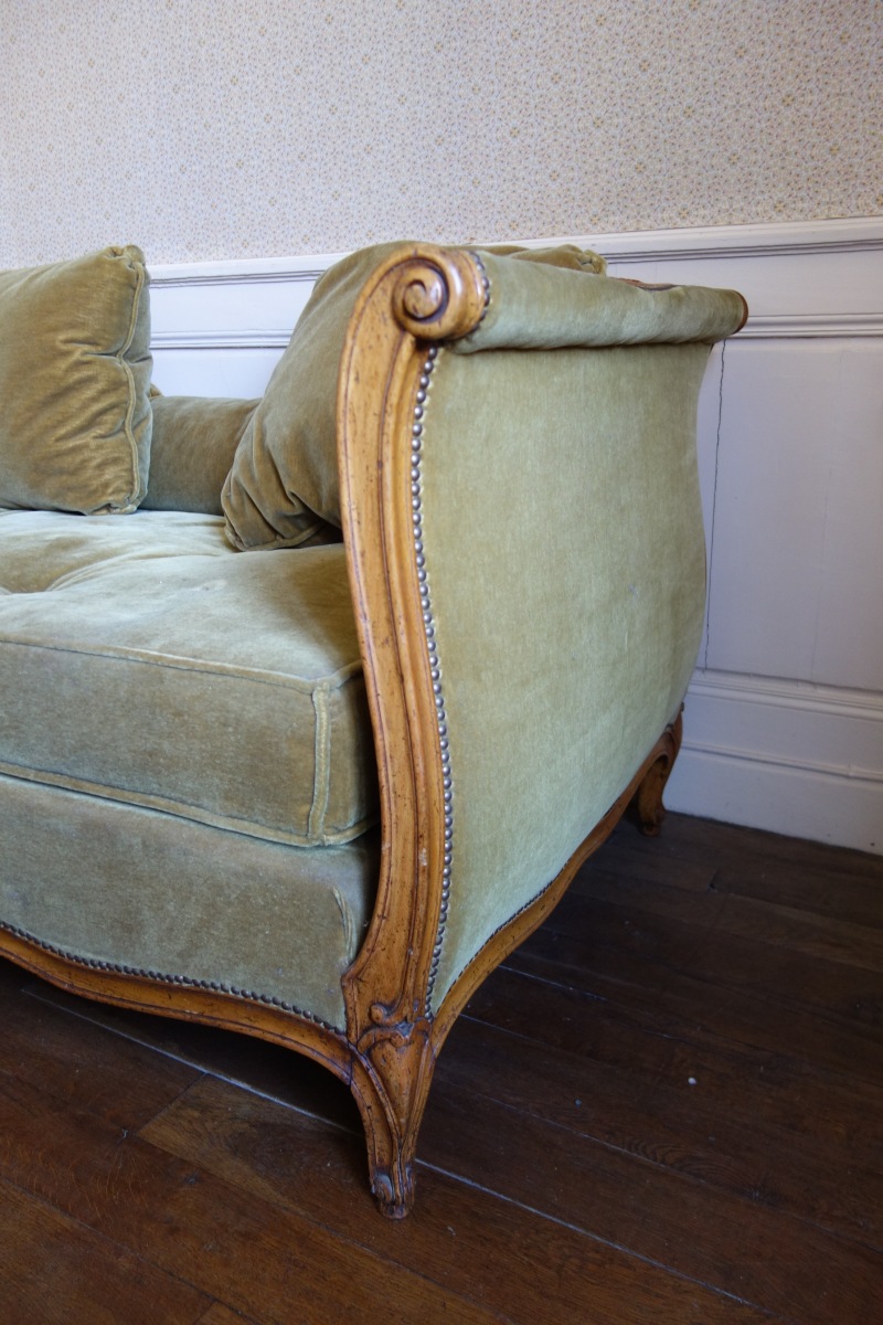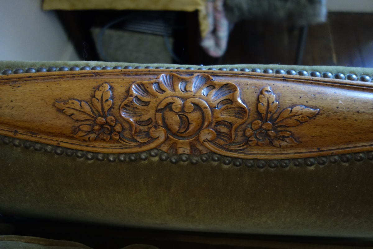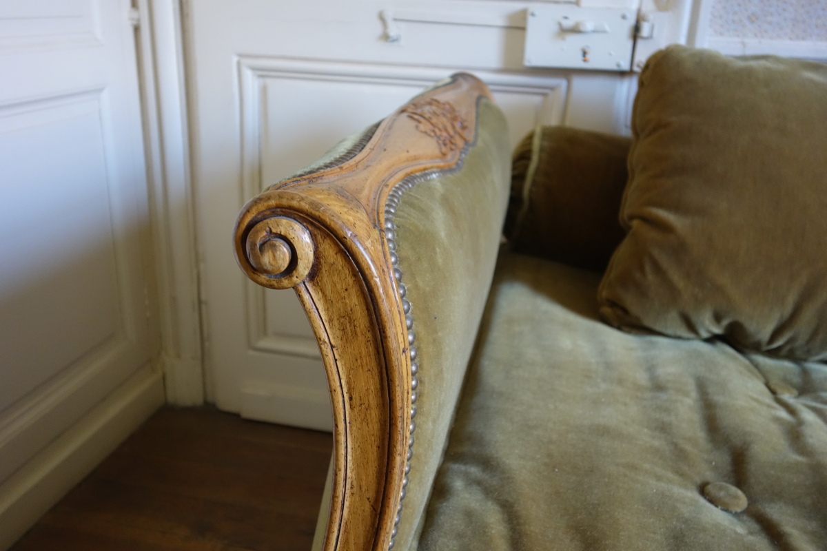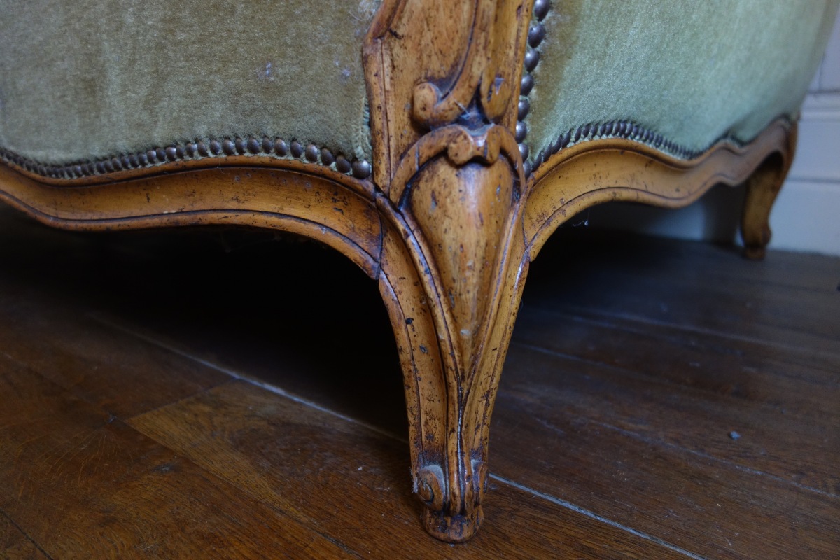BANQUETTE en bois naturel mouluré et sculpté à deux montans en volutes, agrafes et feuillages reposant sur six pieds galbés terminés en enroulaement.
