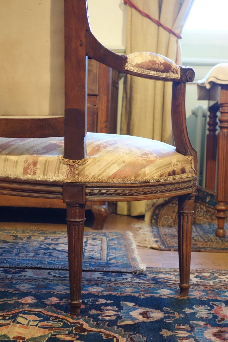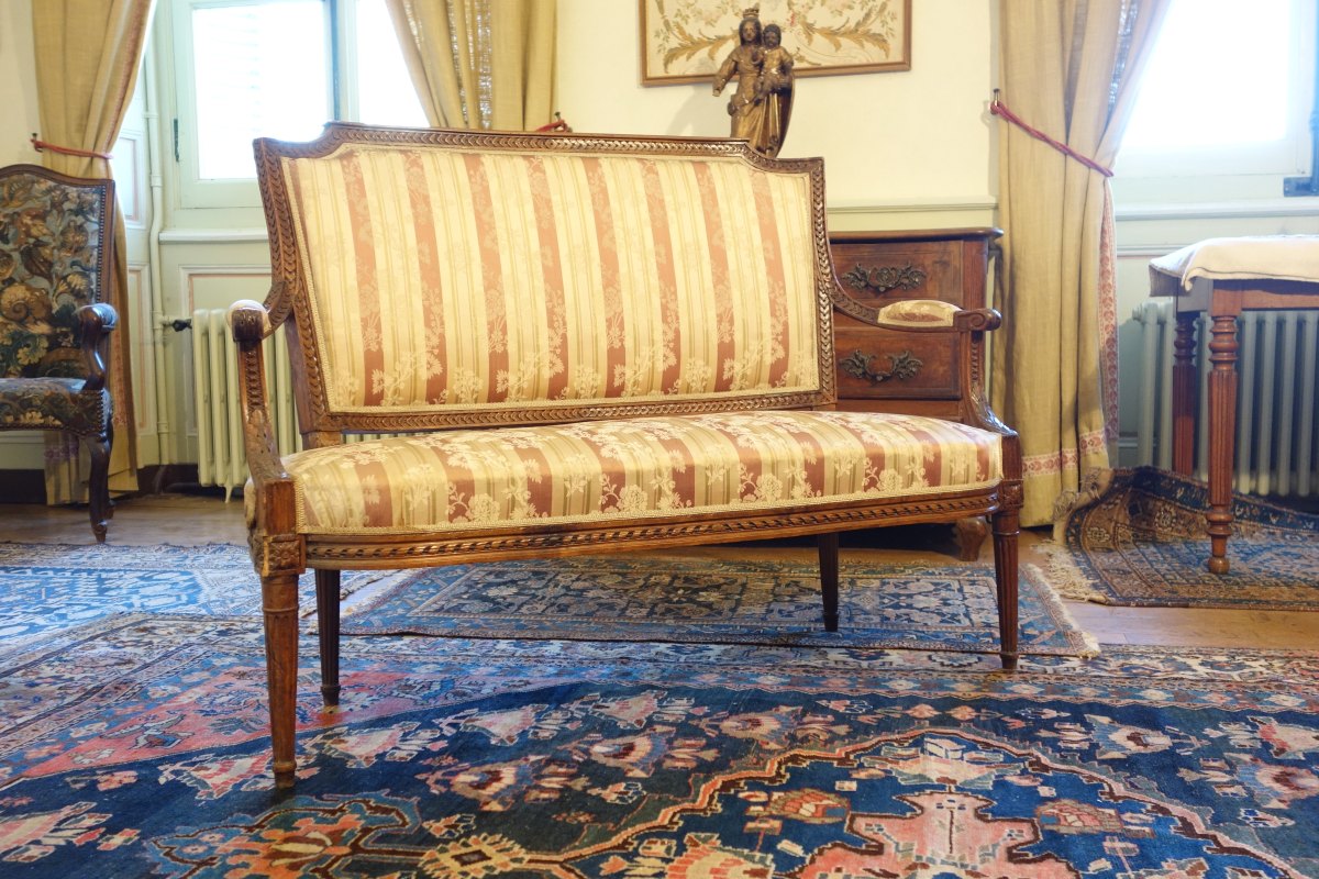 Belle BANQUETTE CORBEILLE à dossier cabriolet ornée d'une frise. Accotoirs en retrait à feuilles. Ceinture enrubannée reposant sur quatre pieds cannelés.