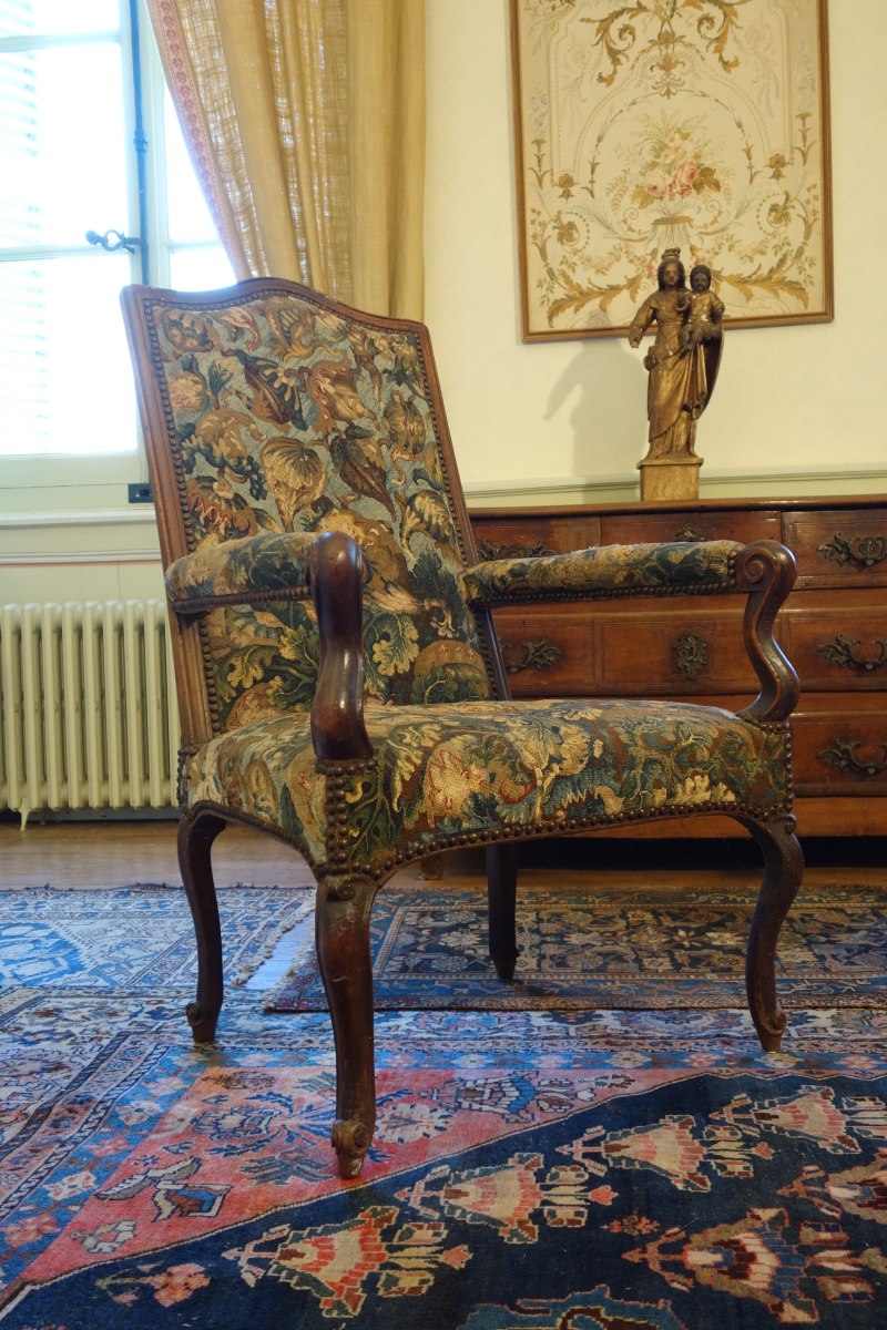 Beau FAUTEUIL en bois naturel, à haut dossier droit légèrement incliné, accotoirs à manchette, reposant sur quatre pieds galbés terminés en escargot avec une garniture en tapisserie. Époque Époque Régence.