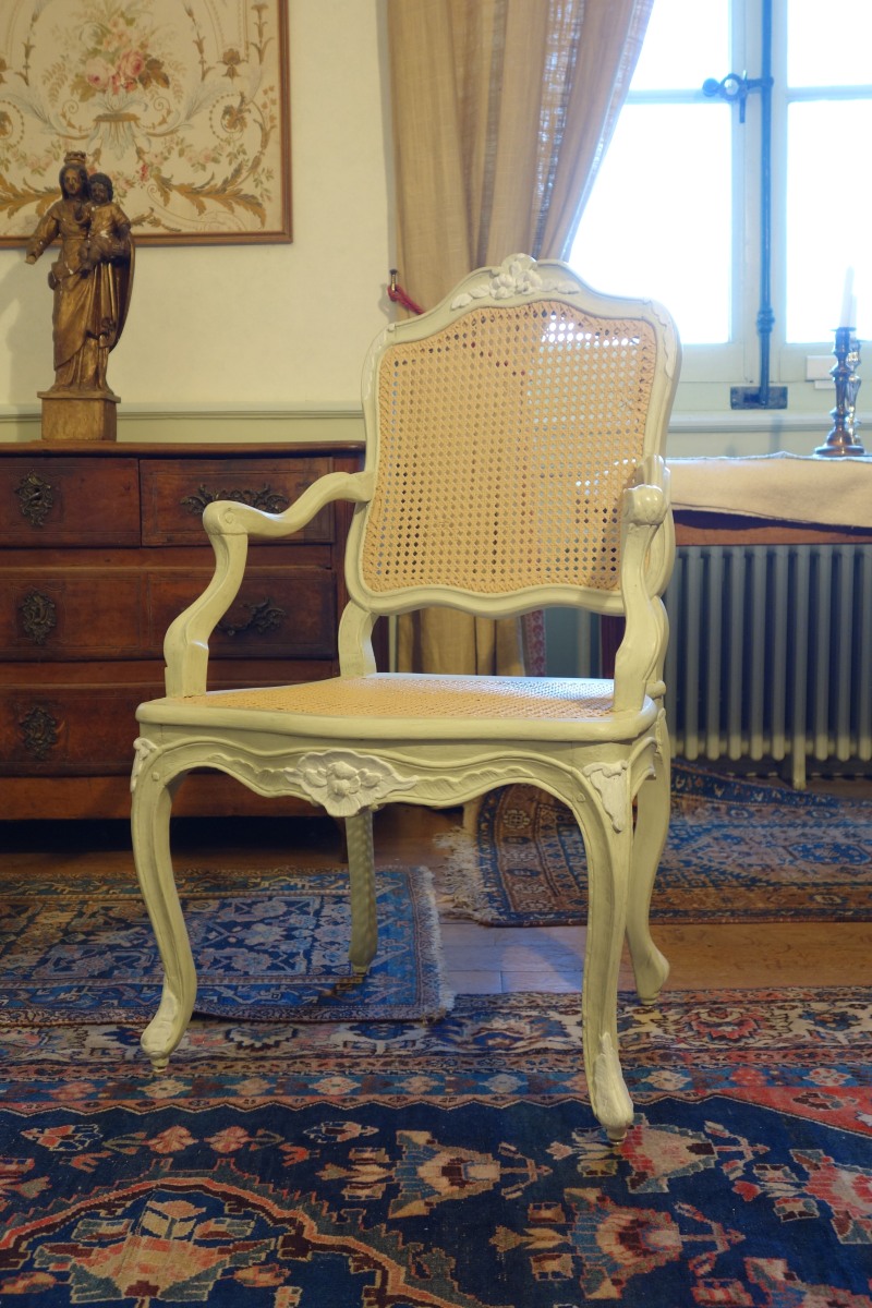 JOINT: FAUTEUIL à DOSSIER à la REINE canné et bois mouluré et relaqué vert d'eau. Style Louis XV ancien.