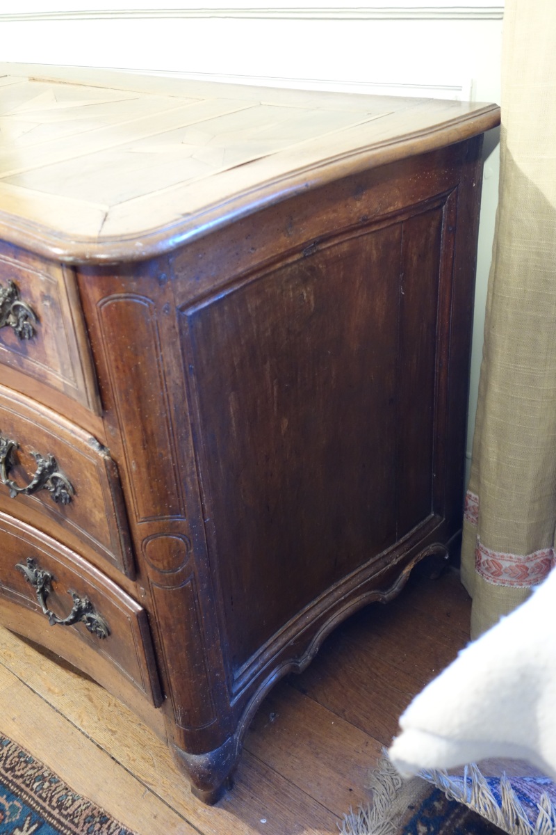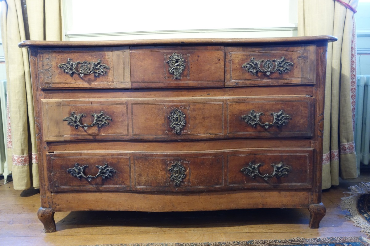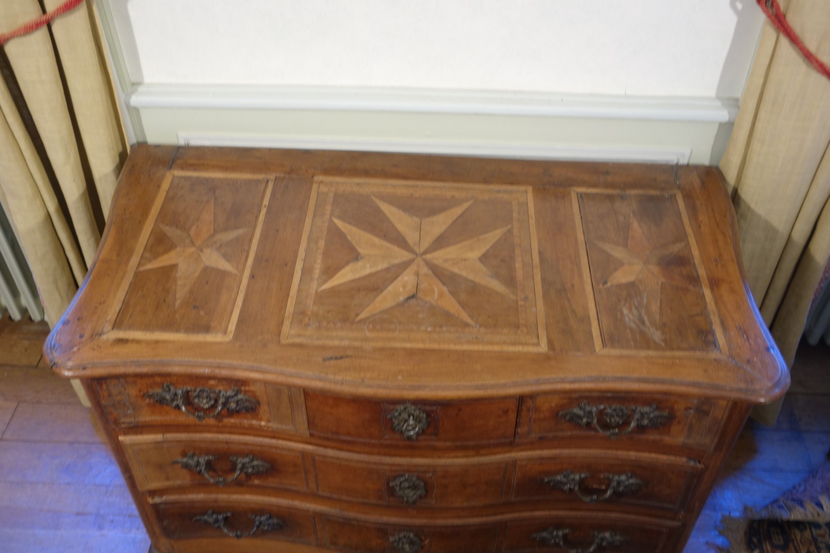COMMODE à façade arbalète en bois naturel ouvrant par cinq tiroirs sur trois rangs. Le plateau marqueté de deux roses des vents entourant la croix de malte. Elle repose sur quatre petits pieds galbés.