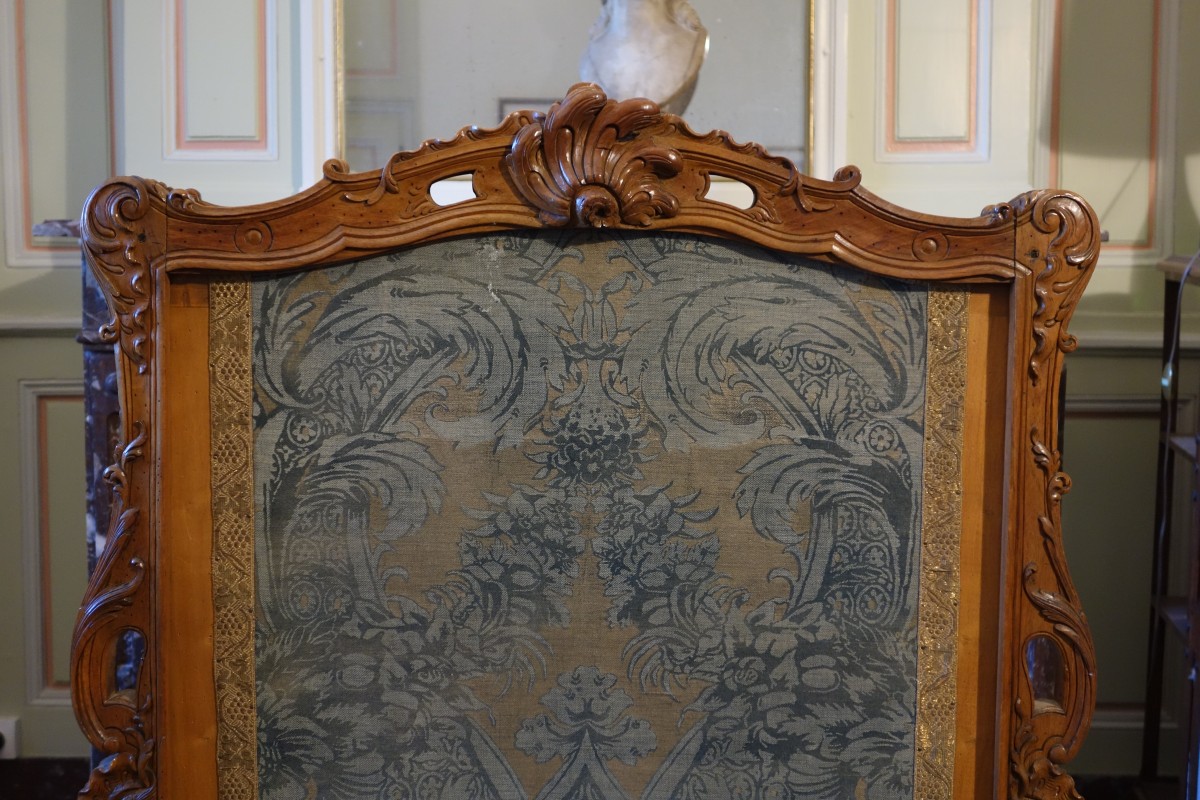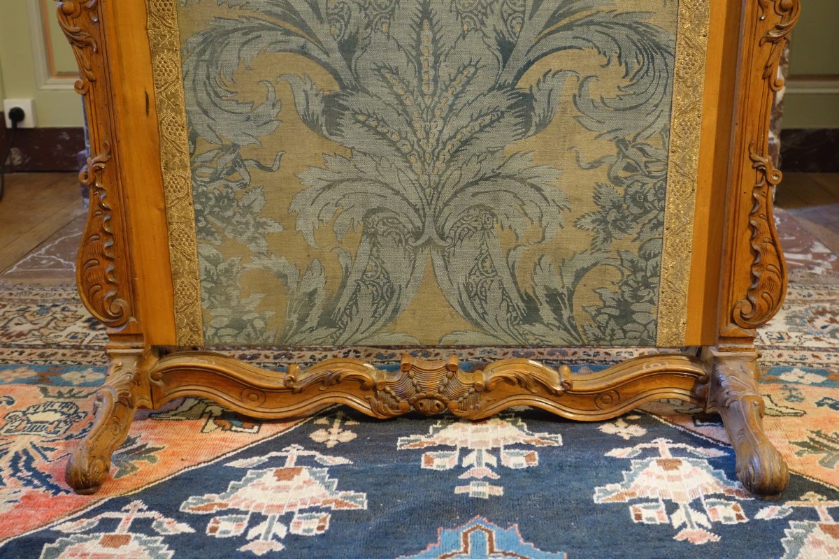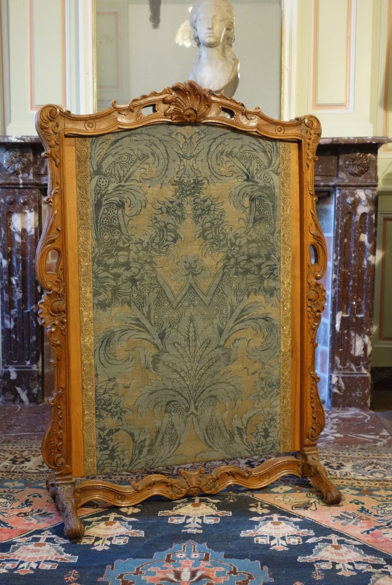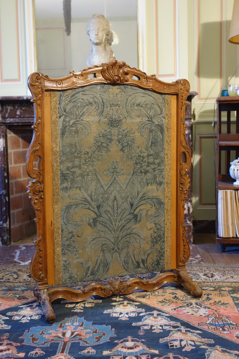 Bel ÉCRAN DE CHEMINÉE à CHASSIS en bois naturel sculpté des deux côtés d'une agrafe mouvementée et ajourée en partie haute, de feuillages, rinceaux sur les côtés et reposant sur quatre pieds patins réunis par une entretoise en H.