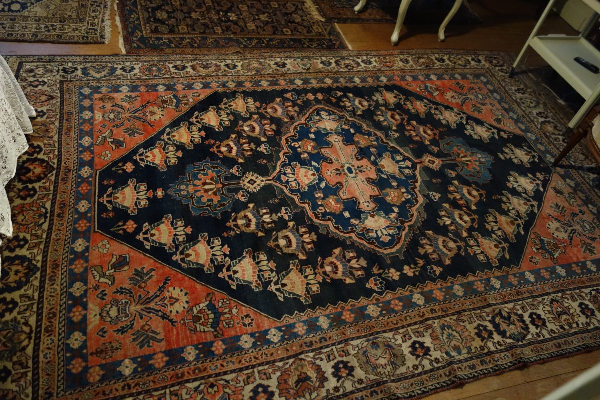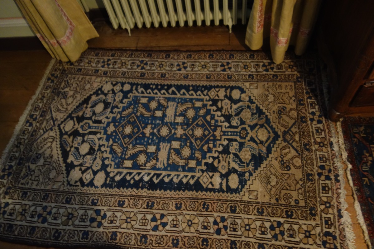 Grand TAPIS D'ORIENT en laine à fond rouge et bleu. Bordure crème.