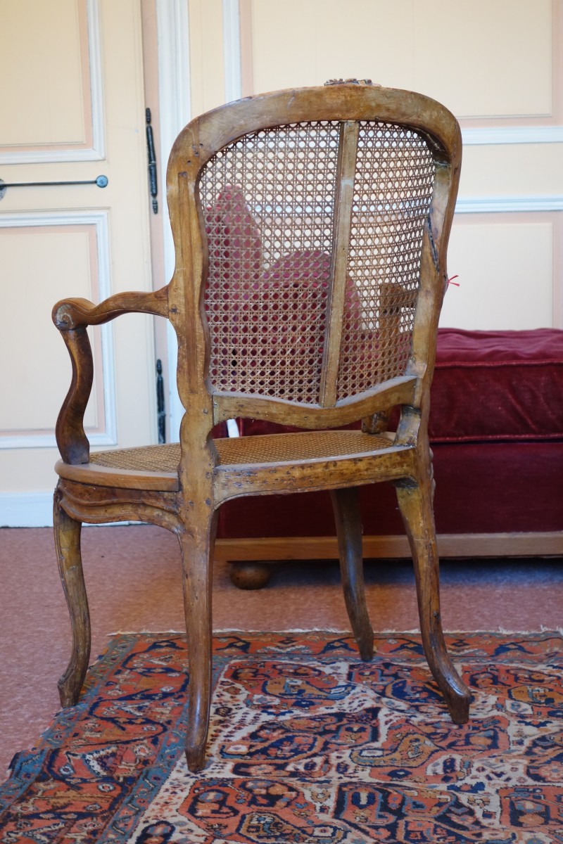 FAUTEUIL CABRIOLET canné en bois mouluré et sculpté. Dossier orné de fleurs à l'amortissement. Accotoirs et consoles d'accotoir mouvementés, la ceinture est centrée d'un motif floral. Il repose sur quatre pieds galbés agrémentés de fleurs.
