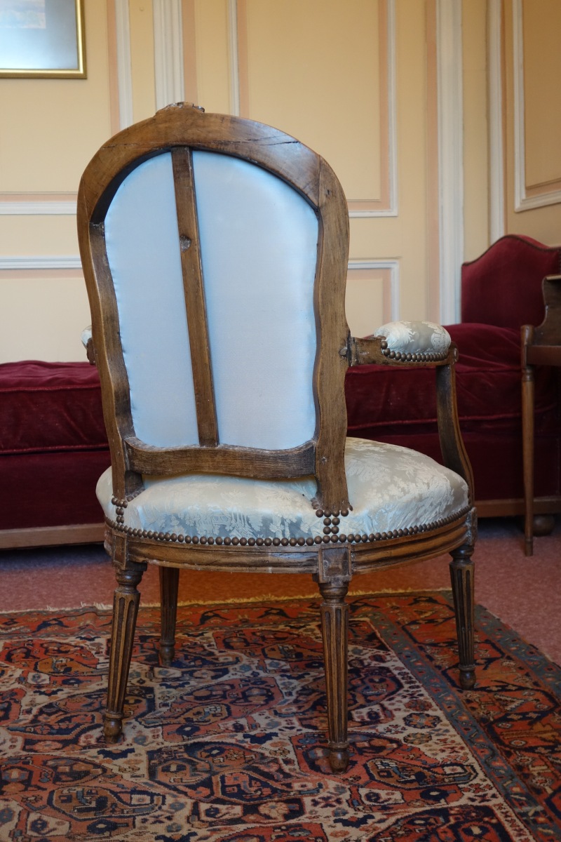JOINT: FAUTEUIL CABRIOLET en bois mouluré et sculpté. Dossier orné de fleurs à l'amortissement. Accotoirs à manchette, consoles d'accotoir galbées et dés de raccordement ornés d'une rosace. Ceinture centrée d'un motif floral. Pieds à section ronde fuselés cannelés, les antérieurs rudentés.