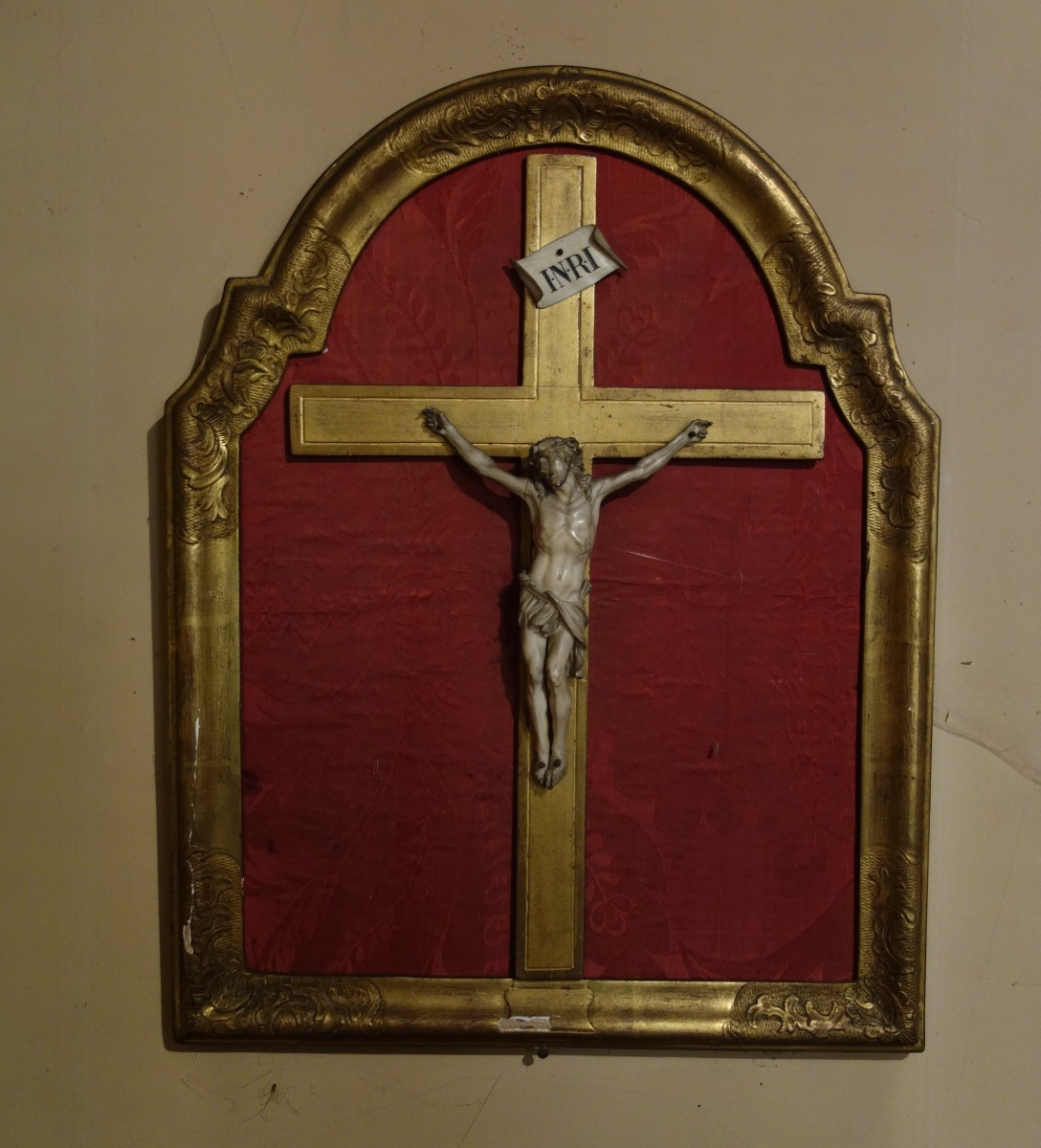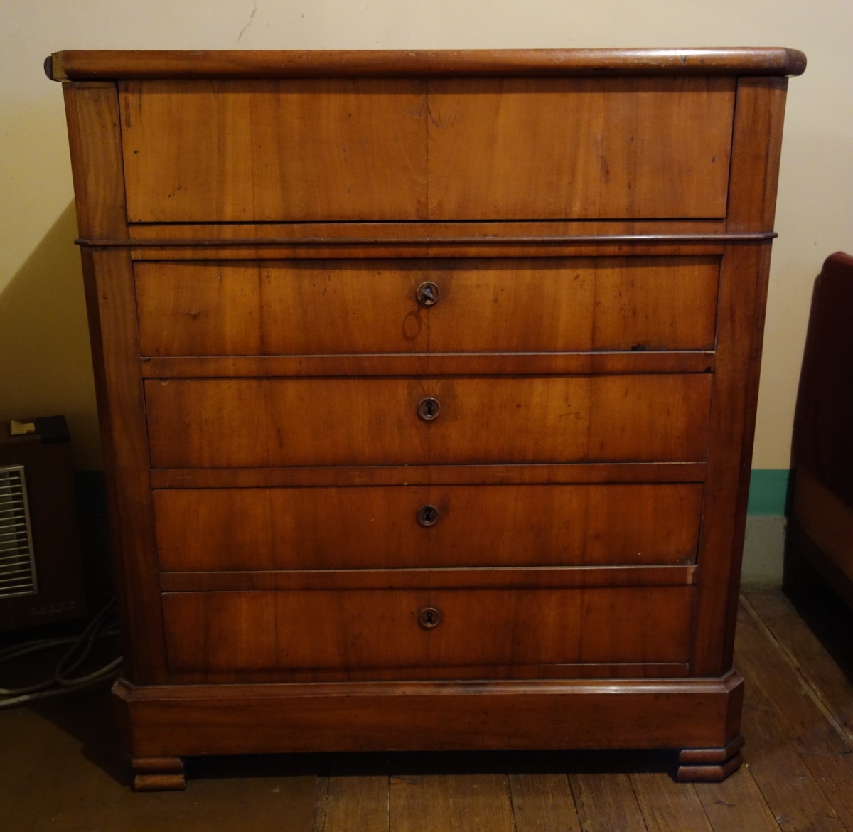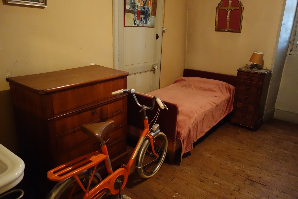 CONTENU DE LA SECONDE CHAMBRE comprenant notamment une commode de toilette ouvrant par 4 tiroirs et un abattant d'époque Louis-Philippe, une table de chevet ouvrant par un abattant et 3 tiroirs - XIXe, un crucifix en ivoire (?) sculpté, un vélo, cinq tapis, peintures A découvrir