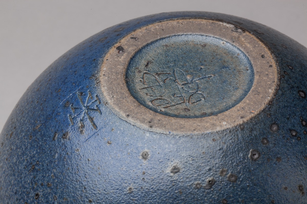 Robert DEBLANDER. Round blue glazed sandstone VASE. Signed.