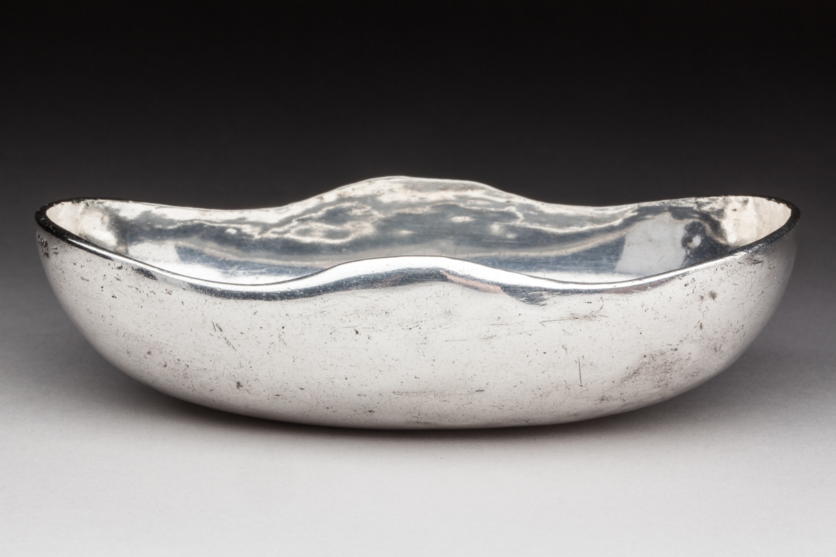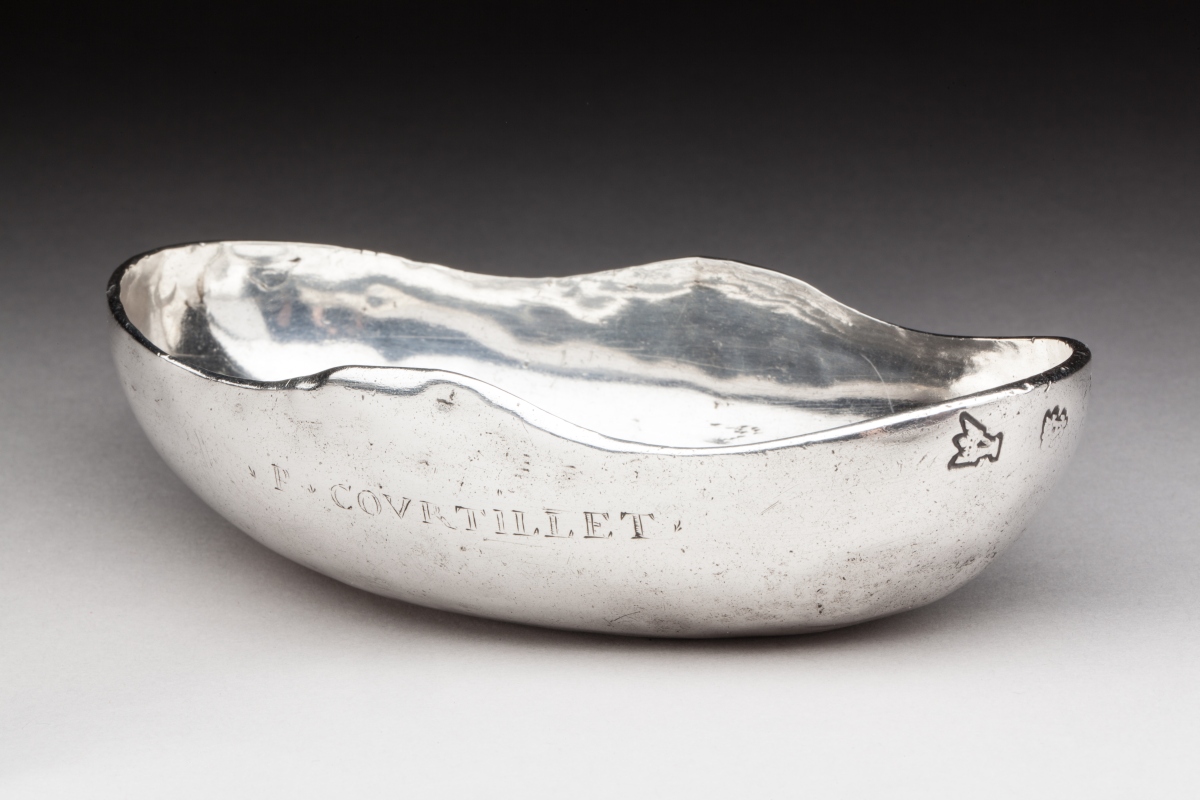 PARIS. TASSE DE CHASSE de forme oblongue en argent uni. La bordure découpée en accolade. Le corps gravé ". P . COVRTILLET . "
