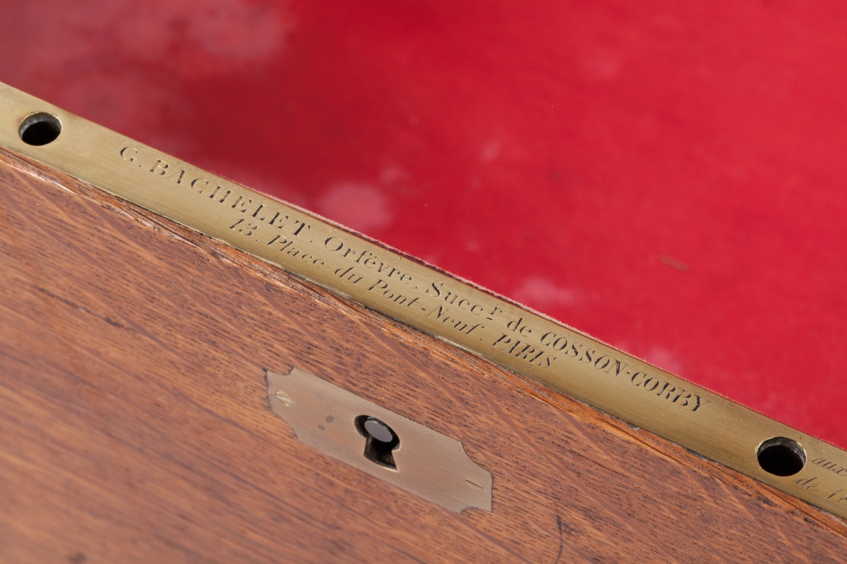 Maître-orfèvre : P, une crosse (?), Q. La serrure du coffre gravée "G. Bachelier, Orfèvre, Succr de Cosson-Corby / 13, Place du Pont-Neuf, Paris / Médailles d'Argent / aux Expositions Univelles / de 1855, 1867 et 1878".