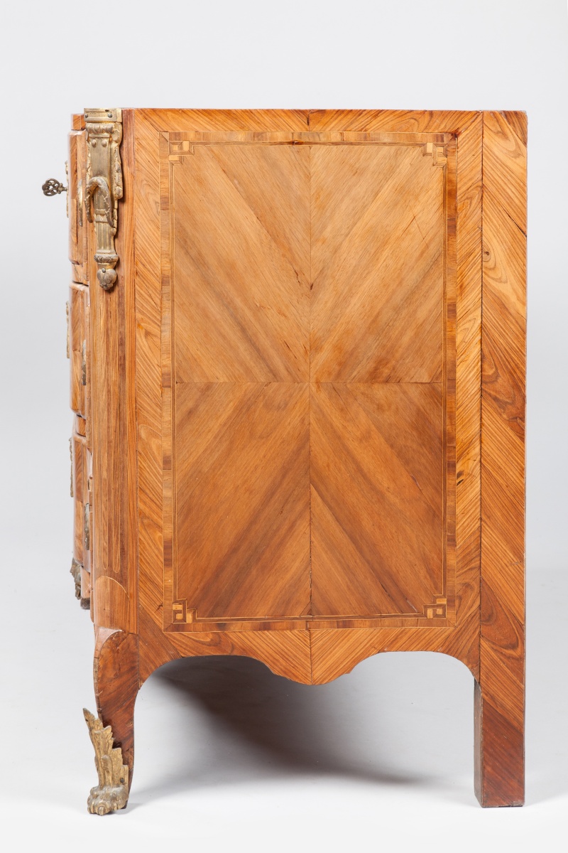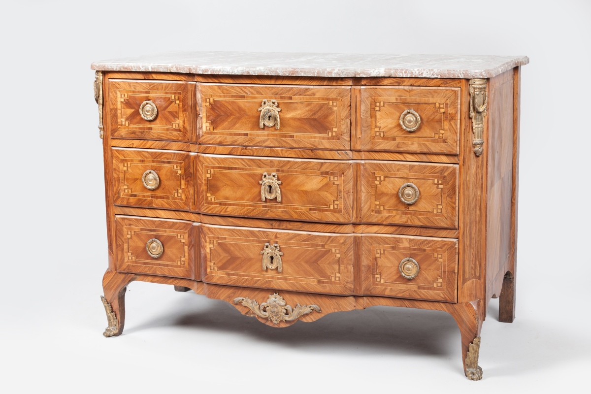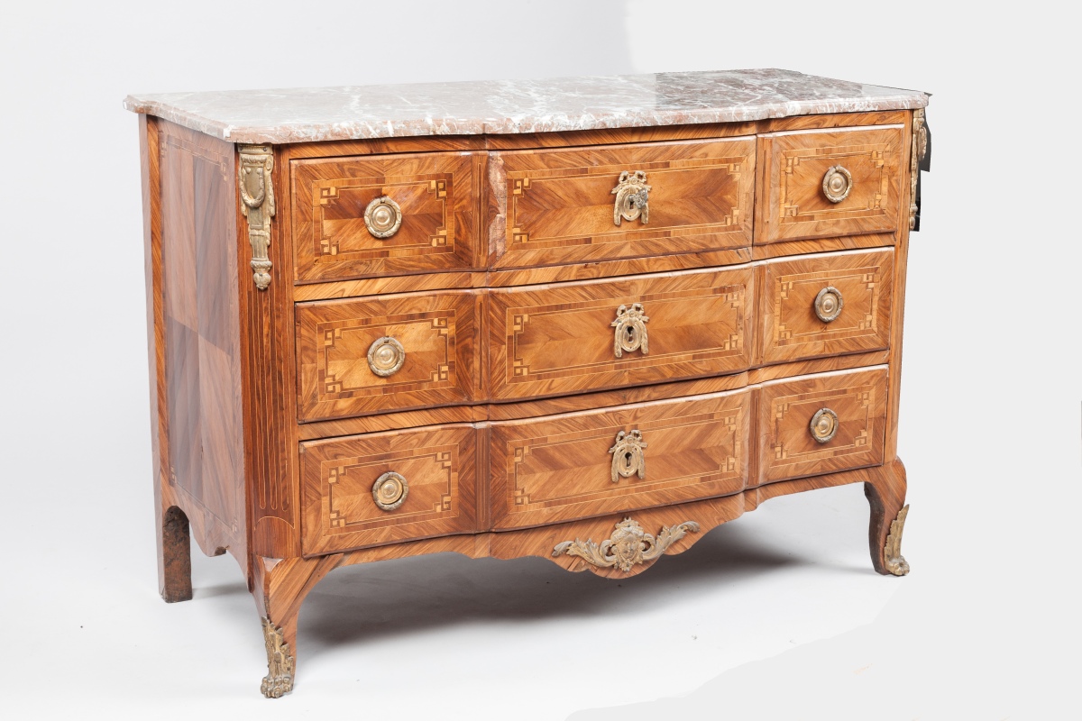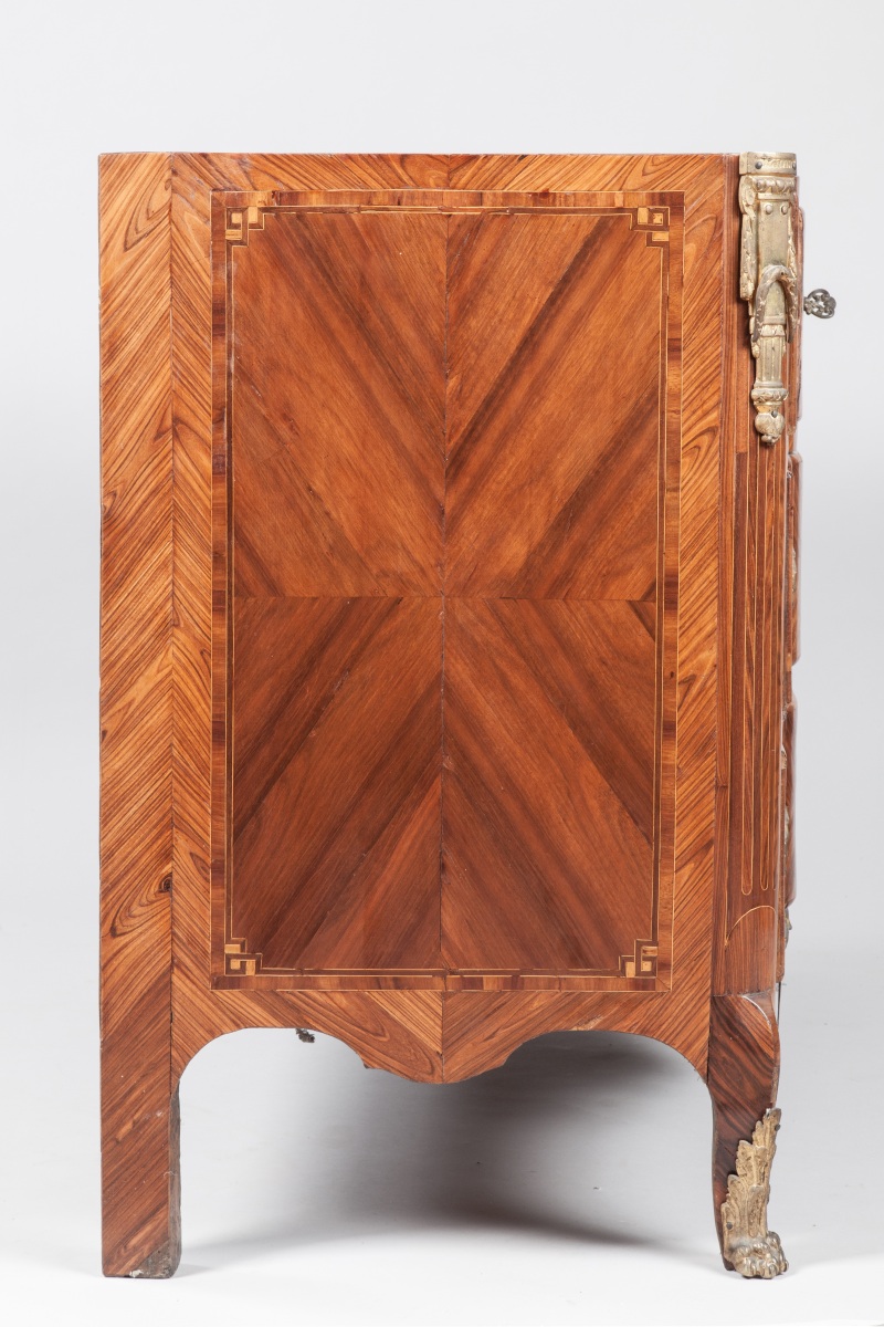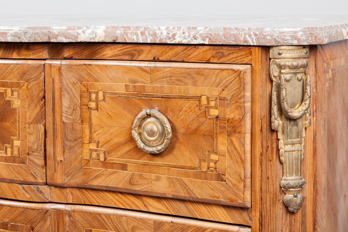 Gilt-bronze mounted oak and satiné marquetry COMMODE covered with a royal red marble top. Transition period.