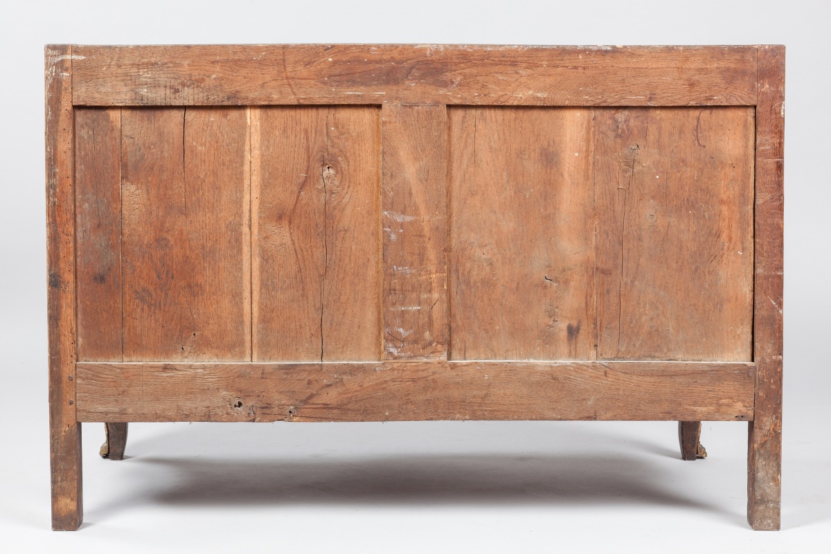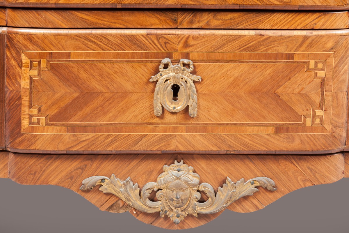 COMMODE À RESSAUT en chêne et placage de satiné ouvrant par cinq tiroirs sur trois rangs. Marqueterie en frisage géométrique. Les montants antérieurs arrondis reposent sur deux petits pieds galbés. Cul de lampe en façade et sur les côtés. Ornementation de bronzes ciselés et dorés de style néoclassique tels que chutes d'angles, entrées de serrure enrubannées, poignées de tirage mobiles en tores de laurier, cul de lampe au masque de Diane et sabots en griffes.