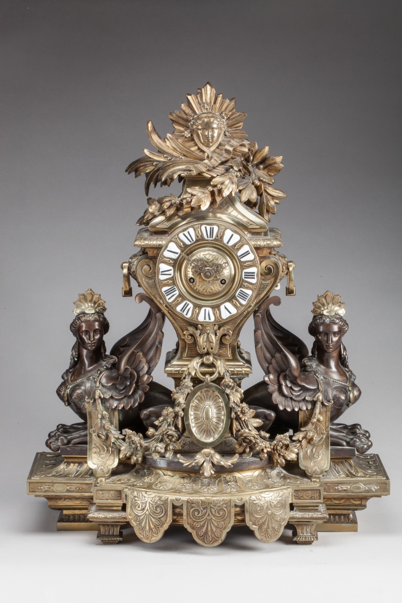 Importante PENDULE DE CHEMINÉE AUX SPHINGES en bronze de deux tons, mat et brillant. La partie centrale en balustre à anses accueille le cadran à cartouches émaillés indiquant les heures en chiffres romains. Elle est ornée à l'amortissement d'un masque d'Apollon agrémenté de palmes et de guirlandes de laurier. En partie inférieure, elle est flanquée de deux sphinges accroupies, costumées et couronnées d'une palmette. Un ombilic à fleuron encadré de guirlandes de fleurs en partie centrale. Terrasse quadripode de forme oblongue à décrochement central recevant un décor de frises feuillagées et tabliers à palmette. Poinçonnée "ER" à plusieurs reprises.