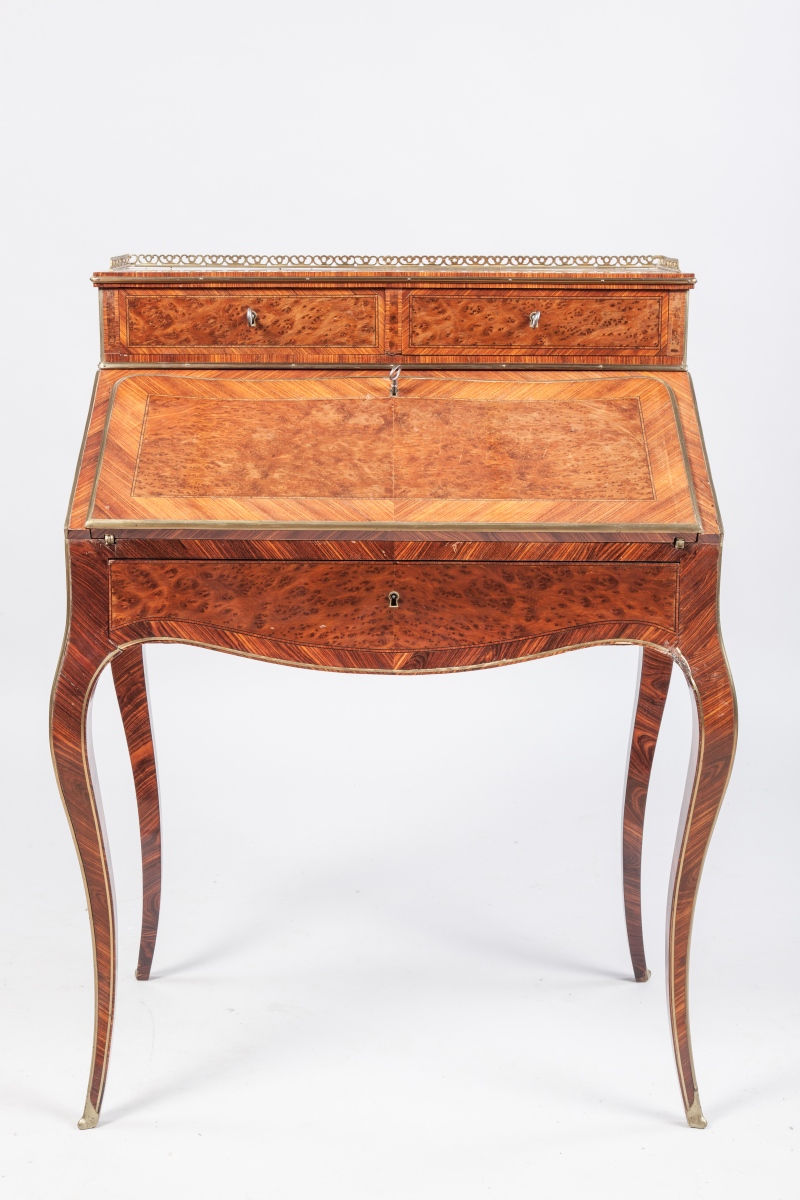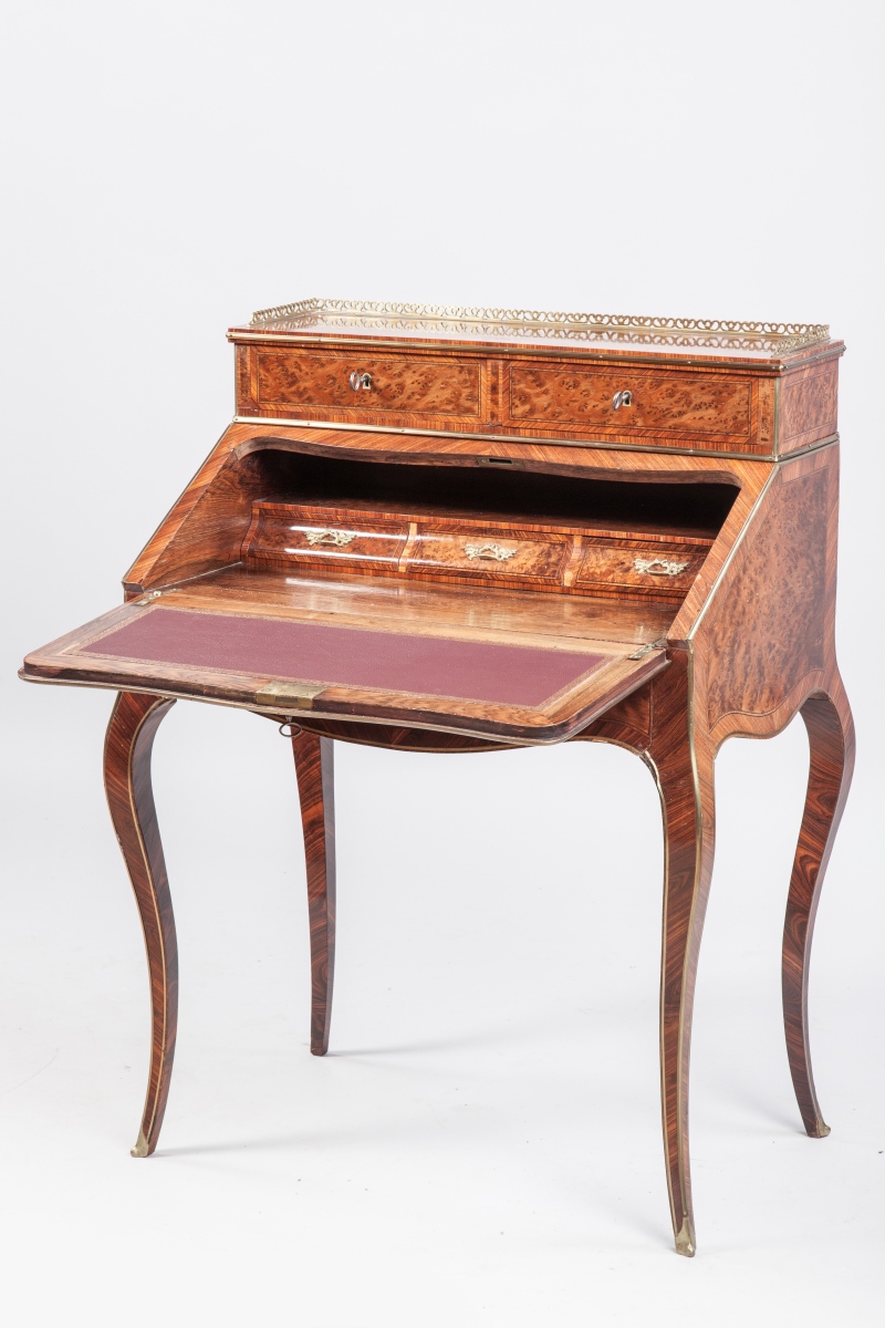 BUREAU DE PENTE en placage toutes faces de ronce de noyer ou loupe d'orme et bois de rose. La partie supérieure en gradin est agrémentée d'une galerie en laiton ajourée d'entrelacs et s'ouvre par deux tiroirs en façade. L'abattant foncé d'un cuir bordeaux découvre un large compartiment garni de trois tiroirs. Leurs façades galbées en placage de loupe d'orme et filets de bois de rose sont ornées de poignées de tirage en rinceaux. Un tiroir en ceinture présente un tablier à la ligne mouvementée. Il repose sur quatre pieds cambrés à pans coupés. Une garniture en filet de laiton souligne les arêtes du meuble et se termine en sabot feuillagé.