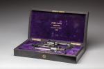 Coffret de forme rectangulaire en placage d'ébène et de bois noirci incrusté d'un écu et de filets de laiton. L'intérieur gainé de velours violet marqué en lettres d'or "Firmin Gaymu / Arquebusier / 20 passage de l'Opéra / Paris".