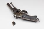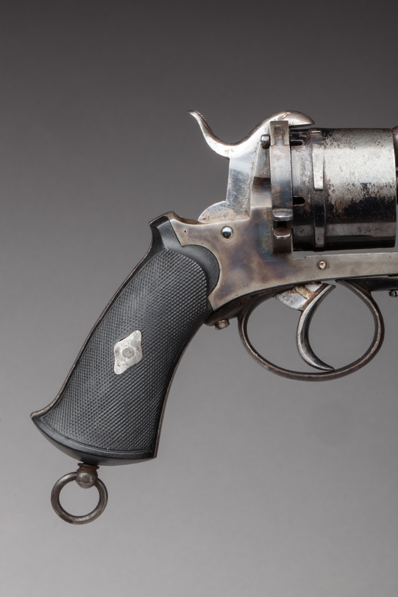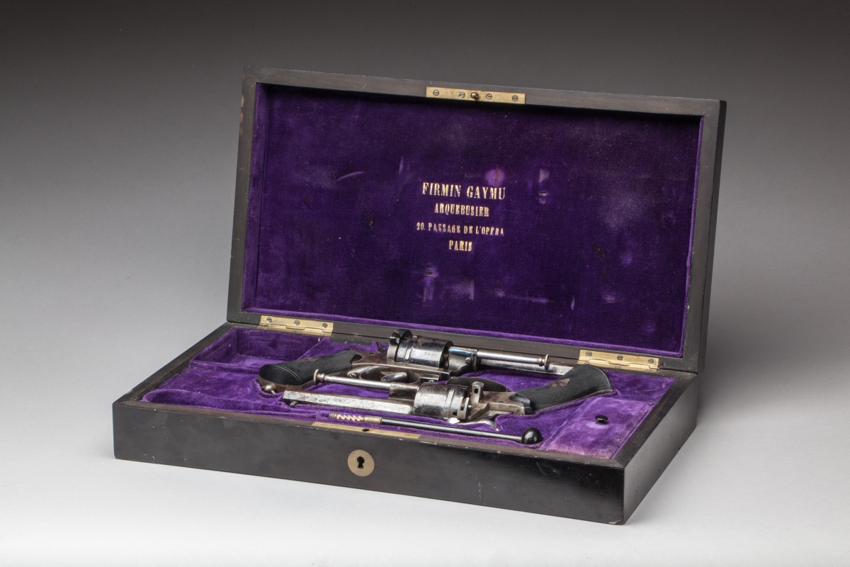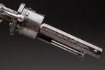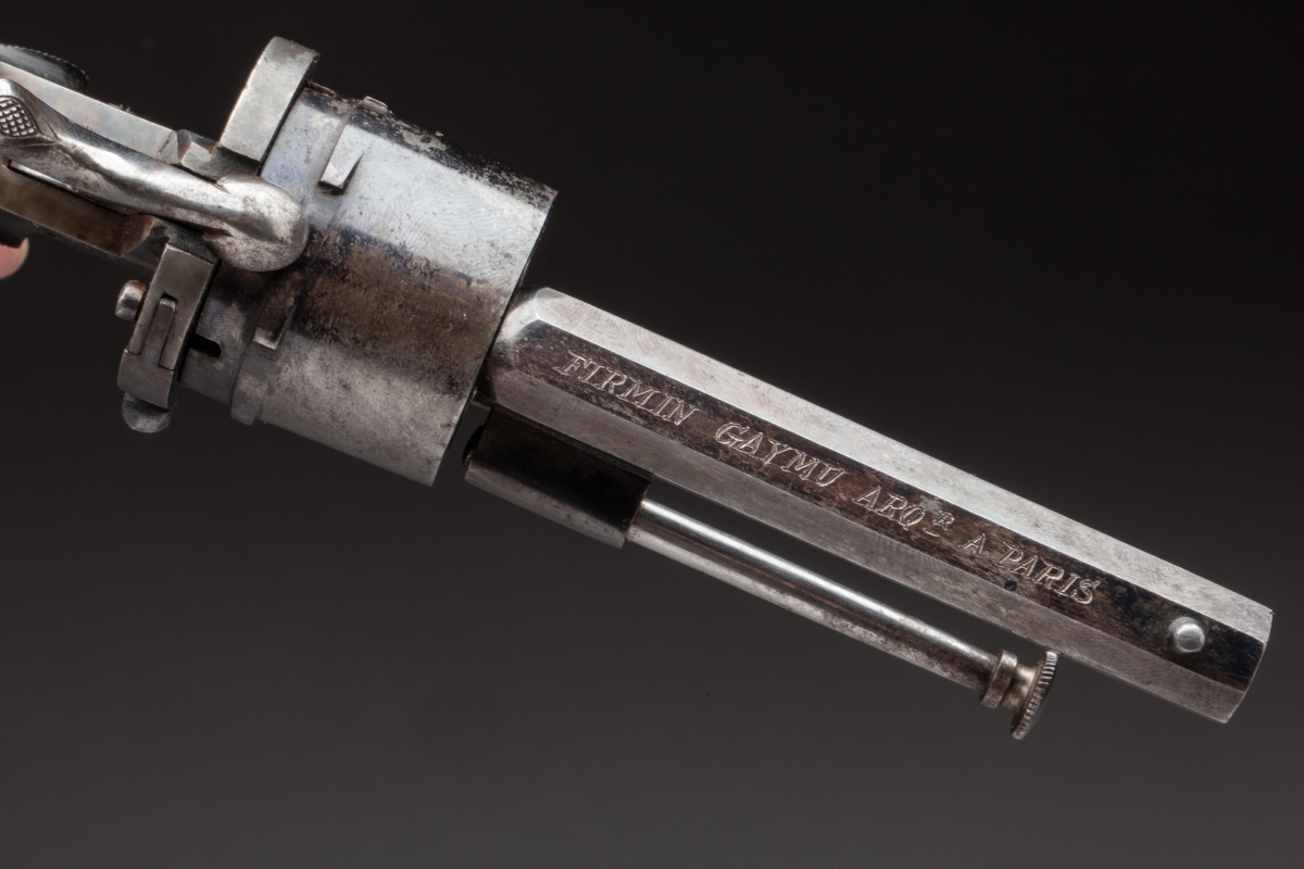 Six coups, calibre 9 mm à broche. Canons octogonaux signés "Firmin Gaymu Arqr à Paris" sur le pan supérieur. Poinçonnés, finition bronzée. Plaquettes en ébène quadrillées. Baguette de nettoyage.