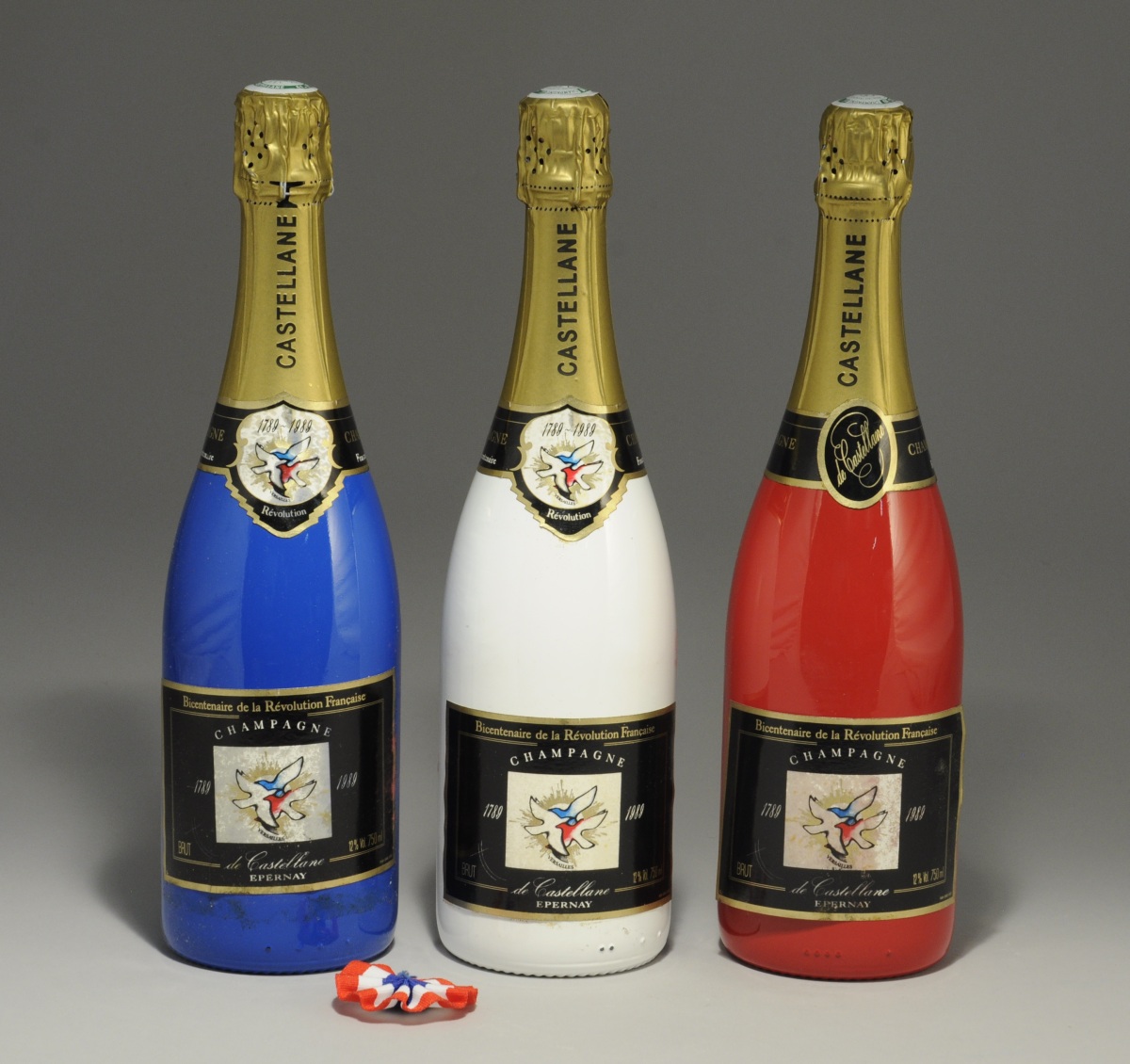 CHAMPAGNE - Maison Castelane - 3 bouteilles de couleur bleue, blanche et rouge commémorant le bicententaire de la Révolution française. Dans leur caisse en bois.