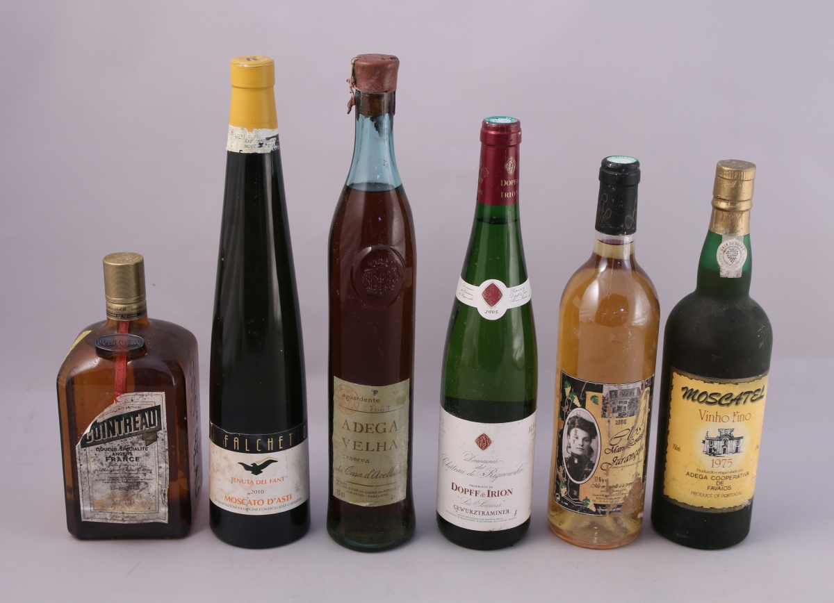 LIQUEURS et VINS BLANCS. 6 BOUTEILLES : Cointreau, Jurançon Clos Marie-Louise 1996, Gewurztraminer Domaine du Château de Riquewihr 2005, Moscatel Vinho Fino 1975, Adega Velha reserva da Casa d'Avella, Moscato d'Asti Tenuta del Fant 2010.