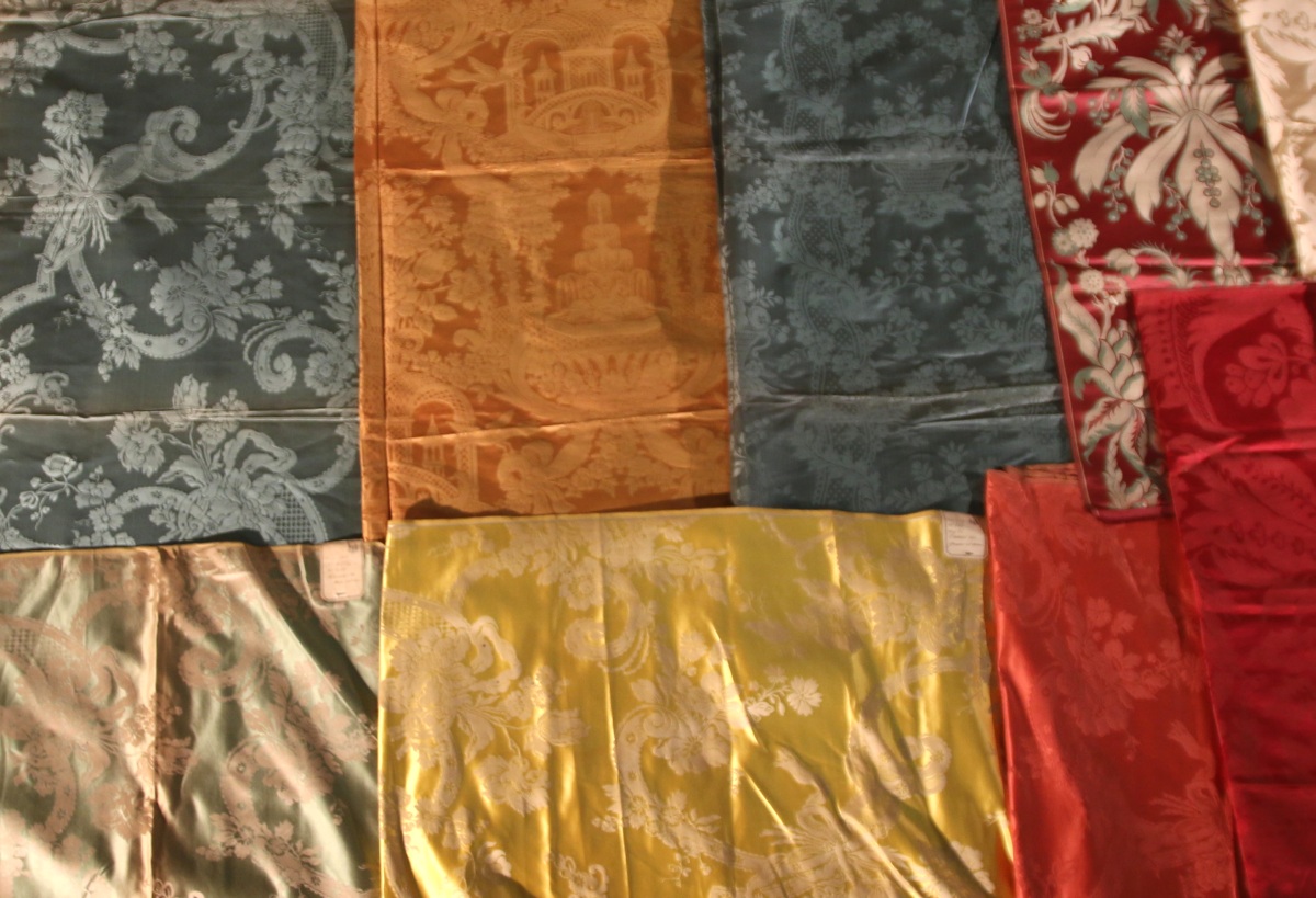 Réunion de DAMAS, LAMPAS, style du XVIIIème siècle, vert, jaune, rouge et crème.