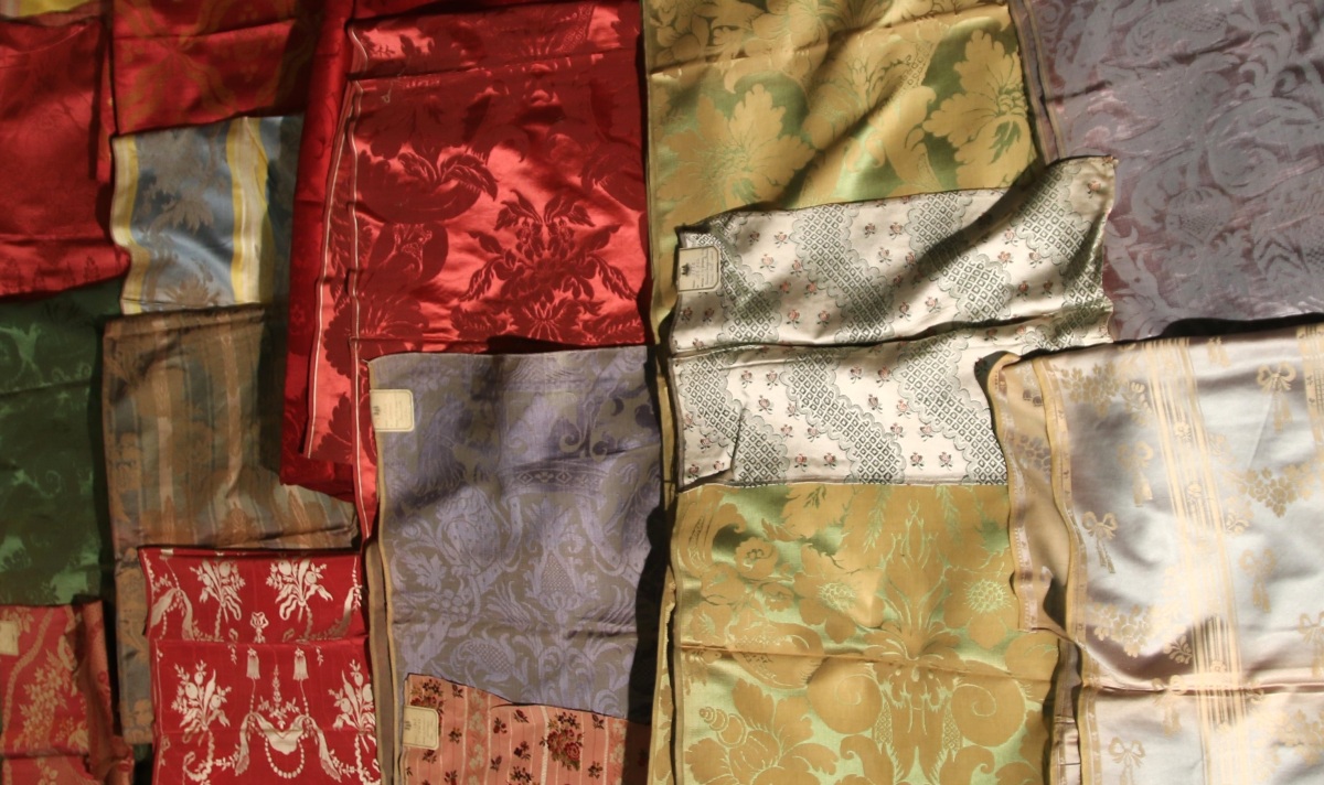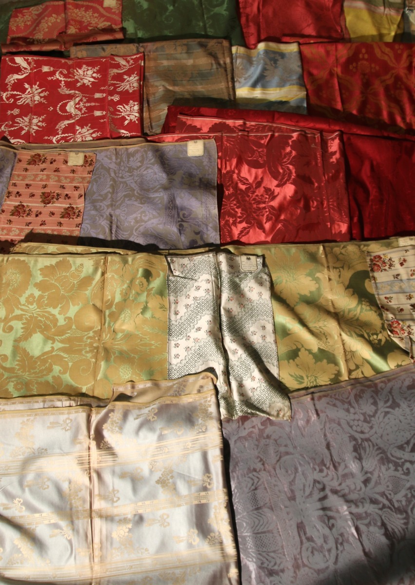 Réunion de DAMAS, LAMPAS, BROCATELLE, MOIRE, style Renaissance et du XVIIIème siècle, vert, jaune, rouge et crème.