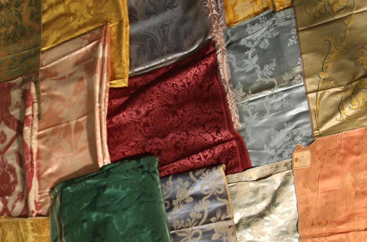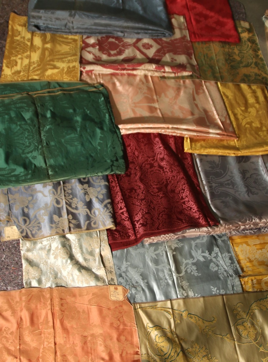 Réunion de DAMAS, LAMPAS, style du XVIIIème siècle, bleu, vert, rouge.