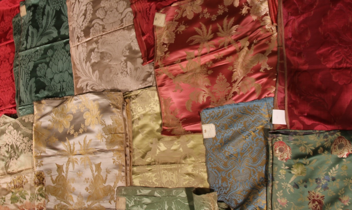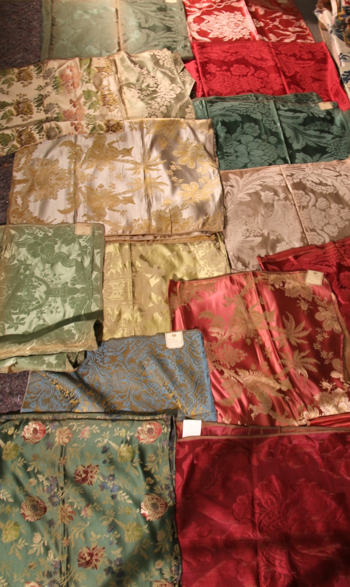 Réunion de DAMAS, LAMPAS, style du XVIIIème siècle, bleu, vert, rouge et crème, fleurs, chinois, oiseaux et fontaines.