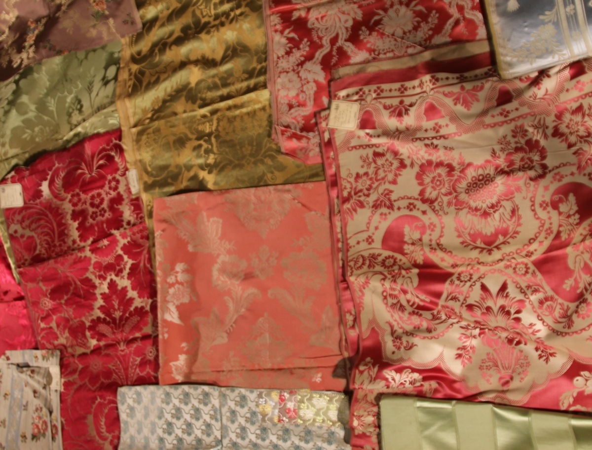 Réunion de DAMAS, LAMPAS, droguet, brocatelle, gourgouran, style du XVIIIème siècle, bleu, vert, rouge et crème.